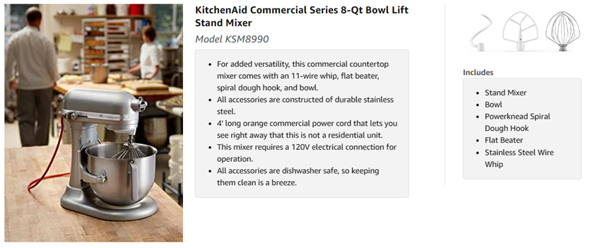 Metal construction, Black in color. Power hub is compatible with all Kitchenaid attachments. Robust metal control knobs. Professional bowl-lift design. Speed control protection. NSF listed. 13-3/8"Wx14-5/8"Dx16-1/2"H. 120V. 1.3 HP. 10 speeds.