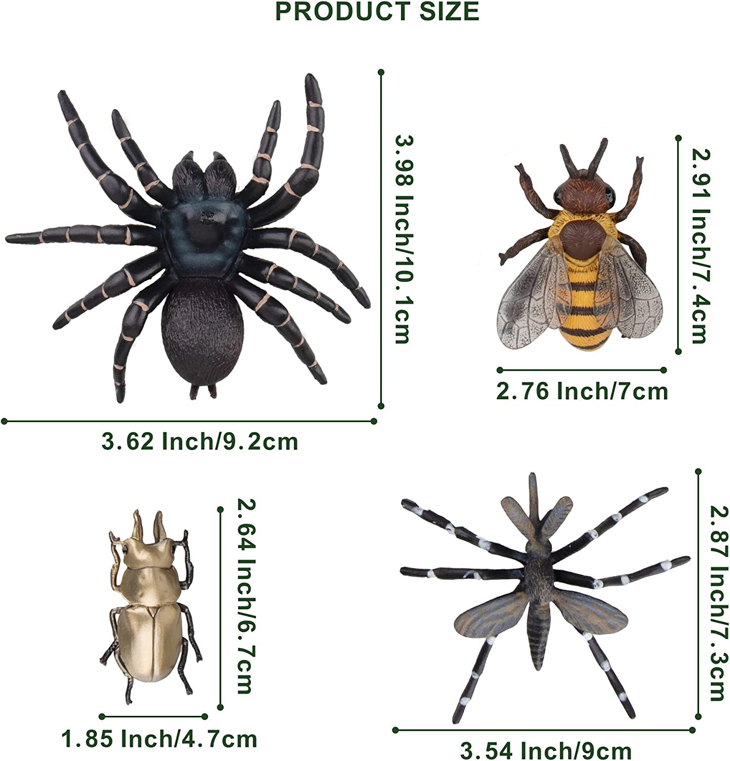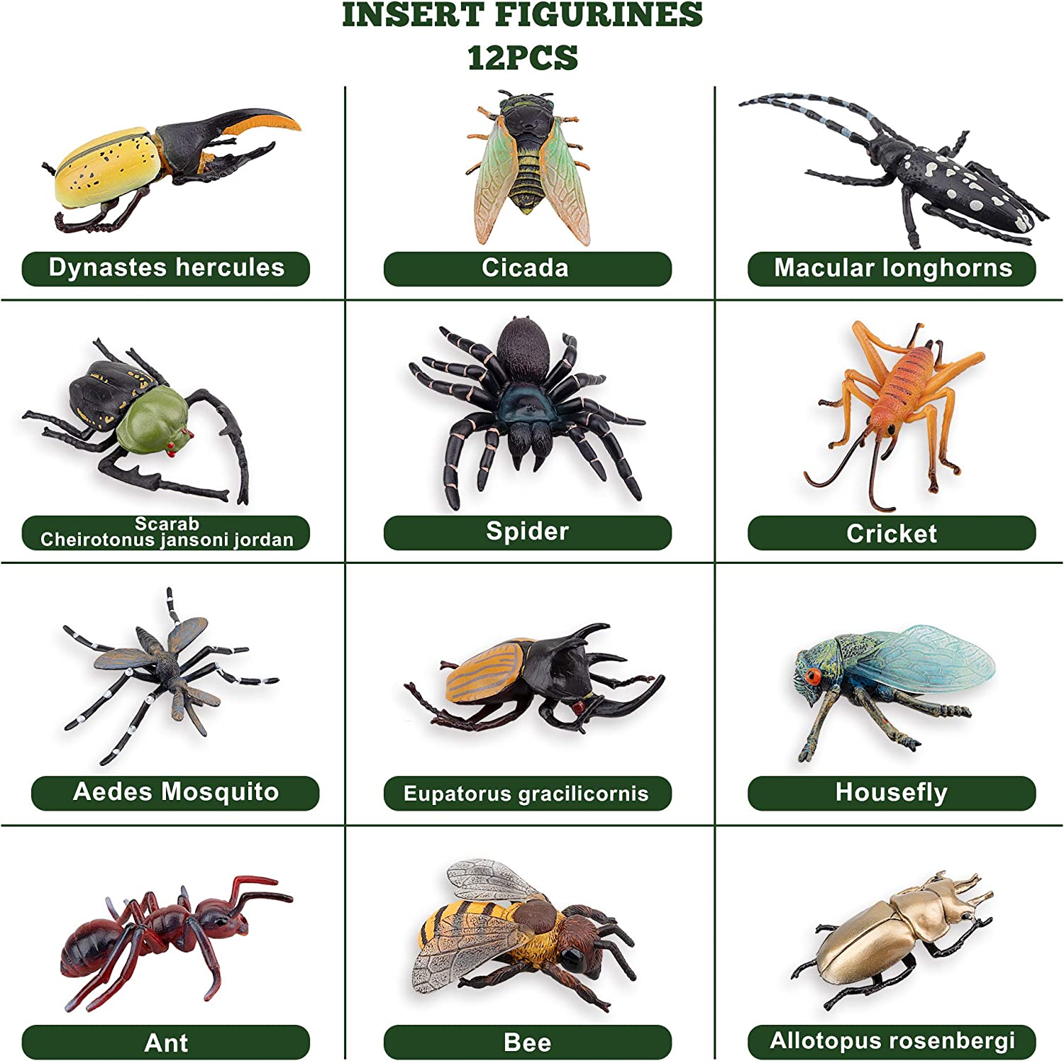 - ✔ 12PCS HIGH QUALITY INSECTS FIGURINES - Includes 1 Dynastes Hercules, 1 Cicada, 1 Macular Longhorns, 1 Scarab Cheirotonus Jansoni Jordan, 1 Spider, 1 Cricket, 1 Aedes Mosquito, 1 Eupatorus Gracilicornis, 1 Housefly, 1 Ant, 1 Bee, 1 Allotopus Rosenbergi. Totally includes 12 bugs figurines.