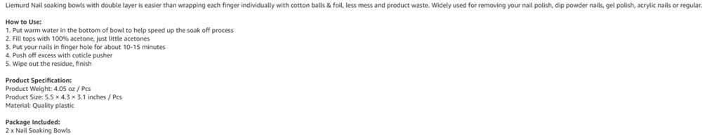 EASY TO USE: You can pour the nail polish remover into the nail soaking bowls, separate fingers gently in a bowl and soak in nail polish remover, fingers are placed vertically so that fingers can be soaked with less nail polish remover.