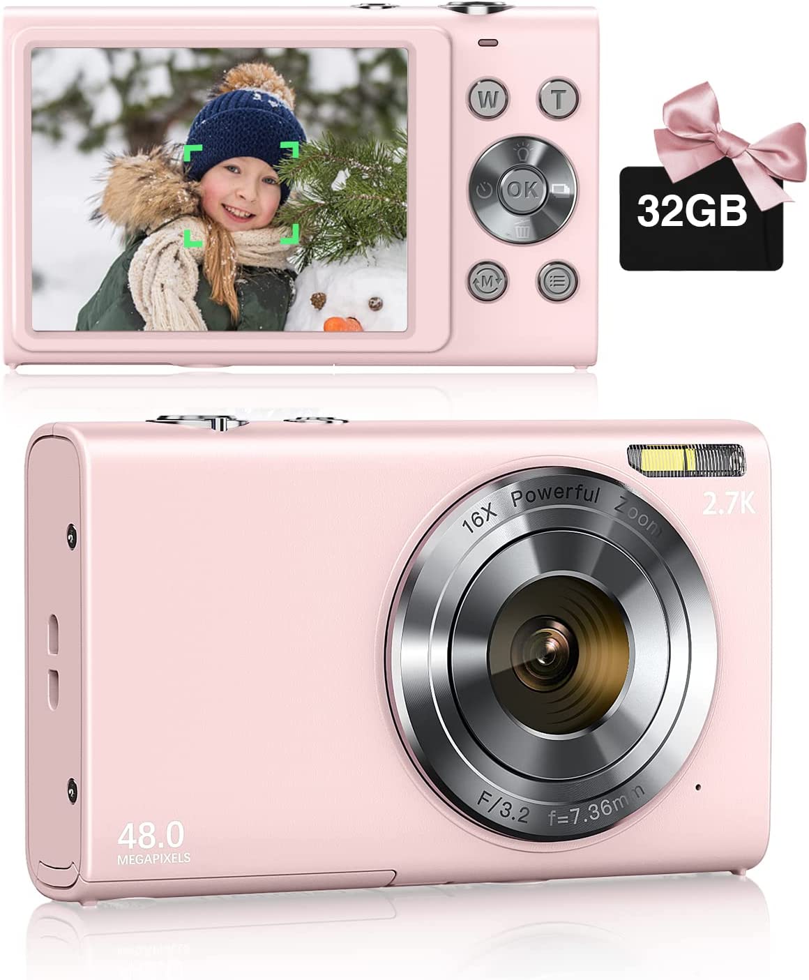 Digital Camera for Kids, Lecran 1080P 44MP Kids Camera with 32GB Card Point and Shoot Camera with 16X Zoom, Compact Portable Cameras Christmas Birthday Gift for Children Kids Teens Girl Boy(Pink)