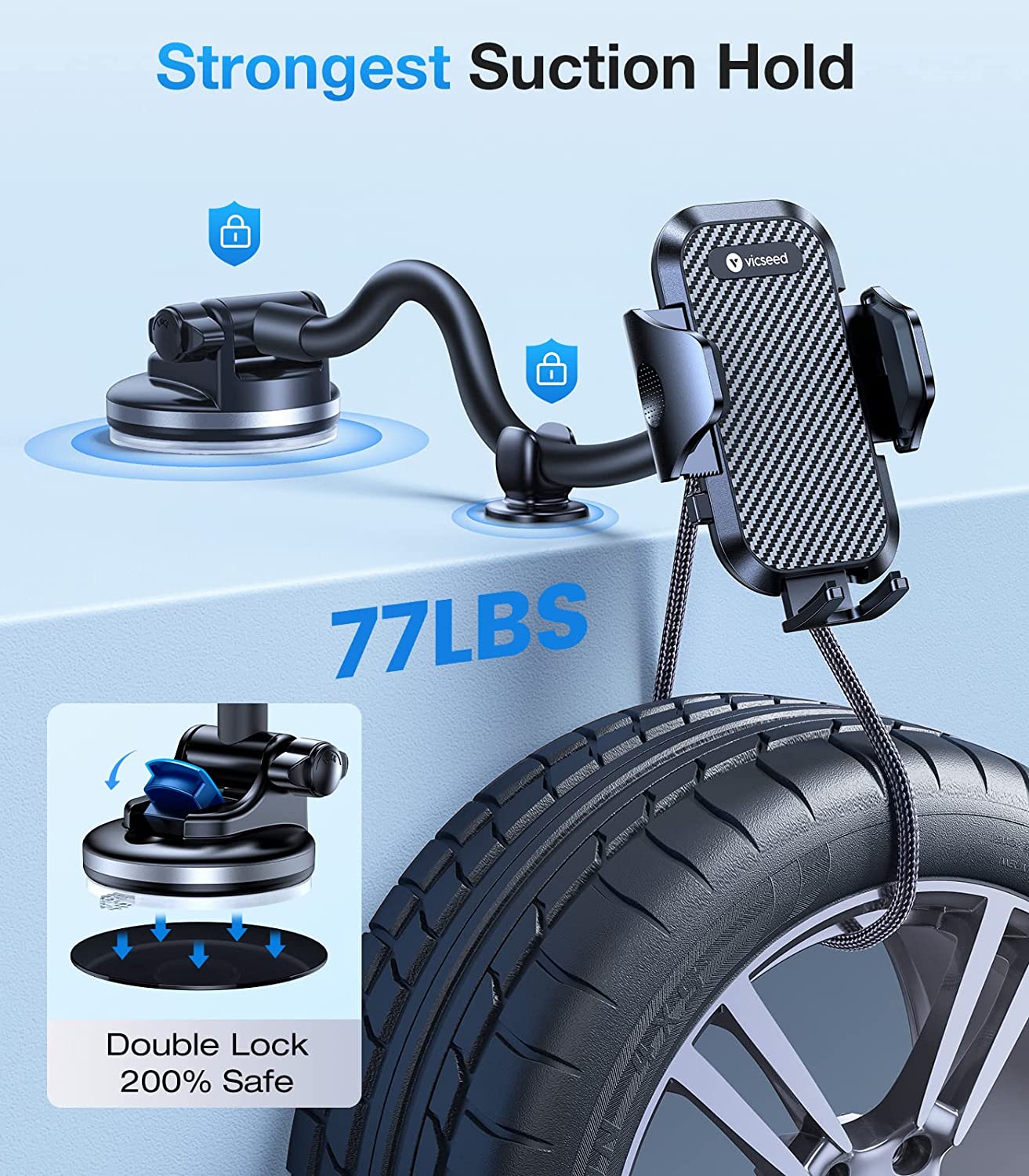 • ?[Strongest Suction, Ensure 300% Stability]①The strongest suction cup of VICSEED car phone mount is made with 3 layers of macromolecule nano-gel, which can provide superior suction power up to 77 LB②The gift 3M adhesive pad offers flat and smooth surface to increase 200% stability and durability③The extra Anti-shake stabilizer make the whole car mount super stable. So this car holder for cell phone can still hold your phone 300% stability without shaking, even on bumpy road or emergency brake!