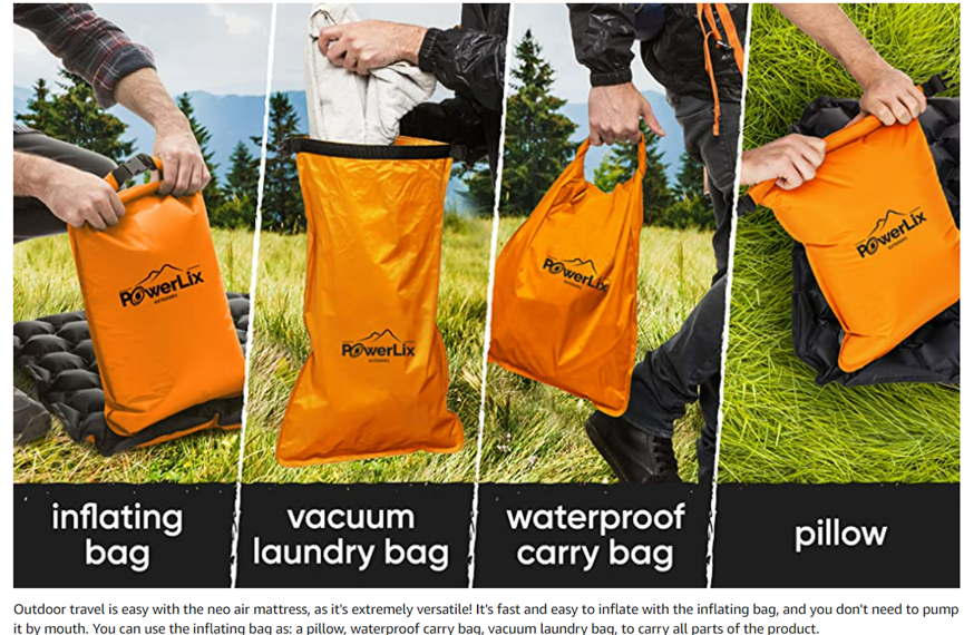 • Everything You Need for Outdoors: This exclusive item comes with a Sleeping Pad, carry bag, 2 repair kits, and an inflating bag. A patch kit is also included, stitched into the top of the storage bag. The inflating bag was designed with you in mind, for all of your needs. In addition to inflating the mattress, it can be used for several different things, such as a pillow, a waterproof carry or laundry bag, or to carry the sleeping mat itself!