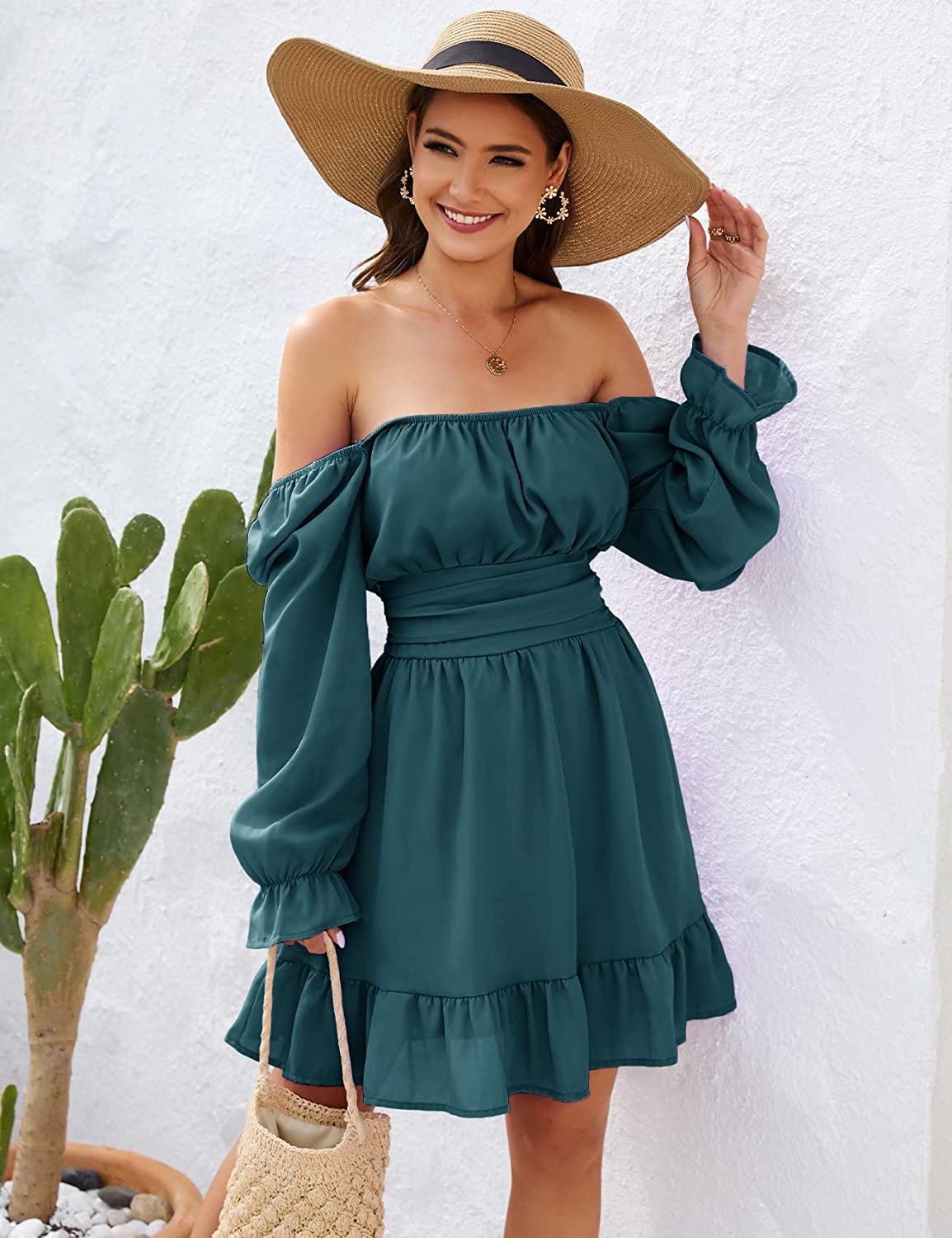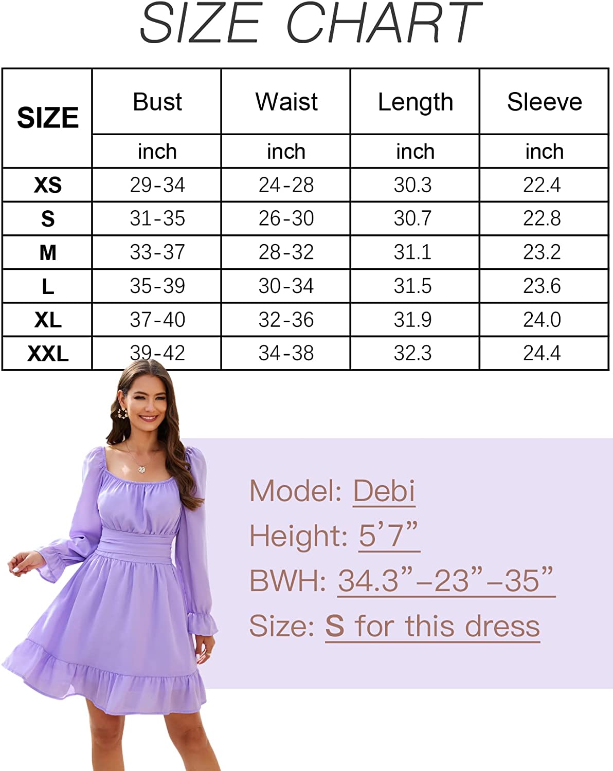 • Features: Square neck, long lantern sleeves, ruffle elastic waist, back tie bow, mini length, slim fit, A-line swing dress, off shoulder if you like.