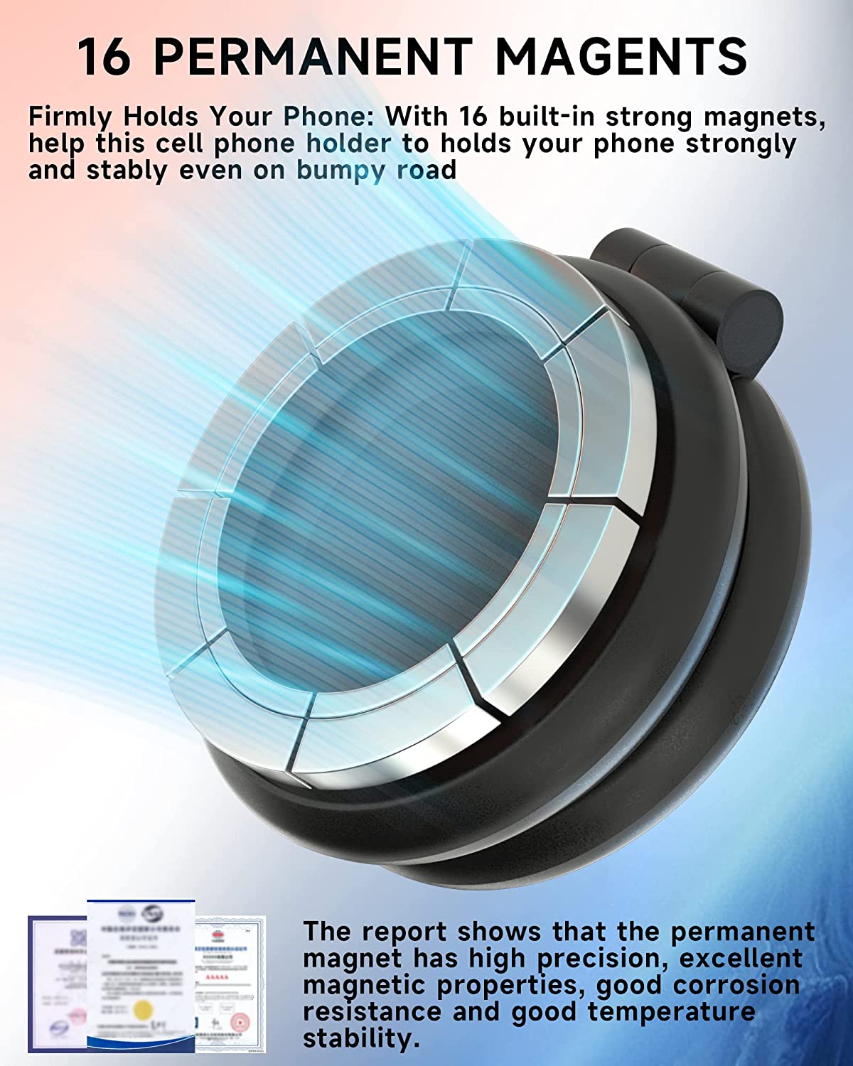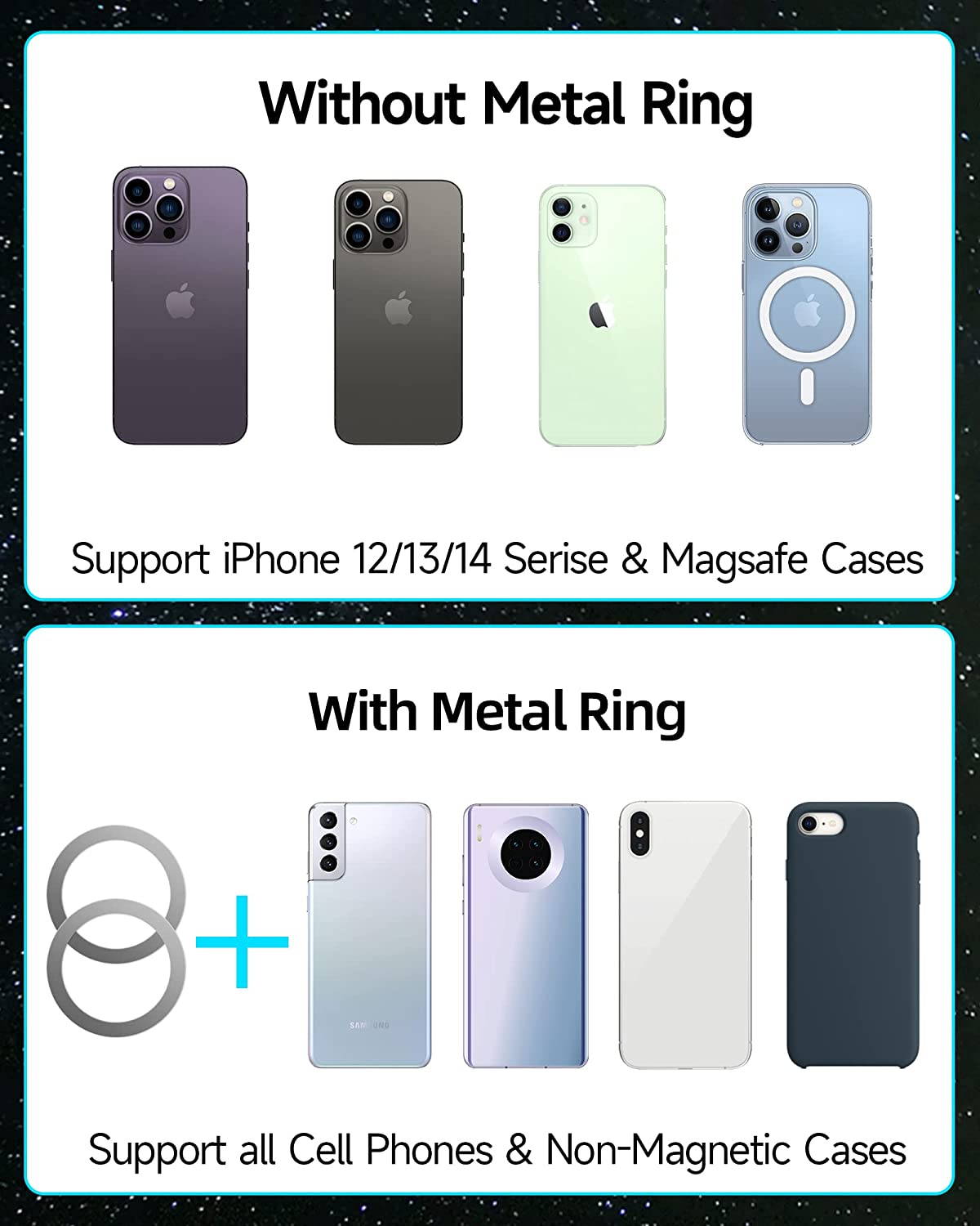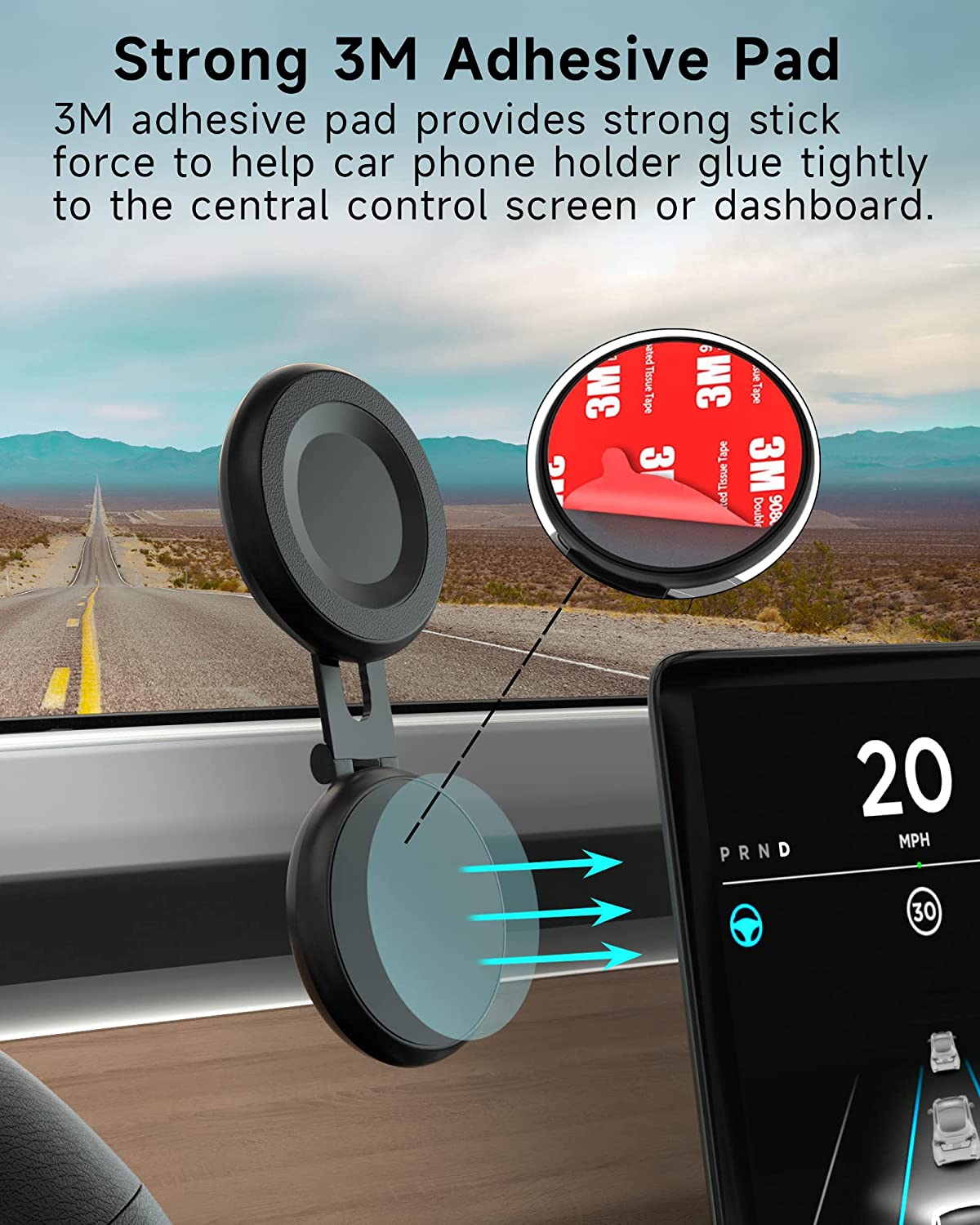 • ?【Upgrade Car Phone Mount】 Tesla phone mount With 24 built-in strong magnets, help this cell phone holder holds your phone firmly and stably even on bumpy roads. The base has 2PCS 3M adhesive pads to allow this phone holder to mount on the dashboard or back of the central control screen firmly without worrying about falling out. (NOTE: If your iPhone 12/13/14 has a thick case or you use other iPhone or Android phones, please stick the metal ring on the back of your phone or case.)