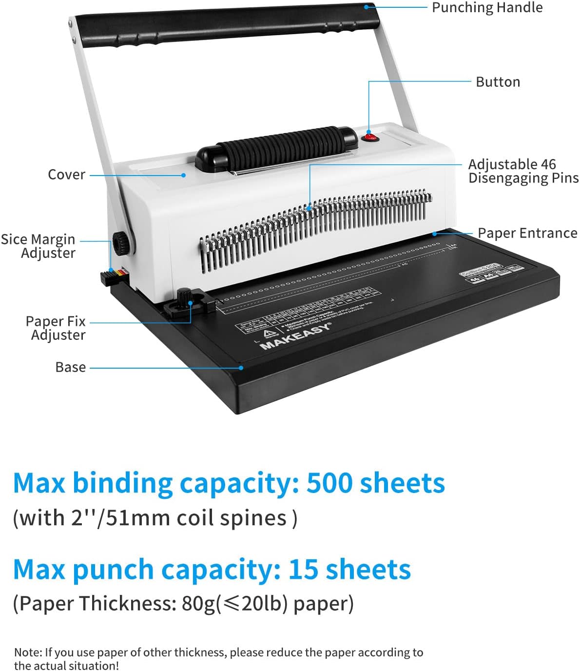MAKEASY Spiral Coil Binding Machine for LTR/A4 - Disengaging Pins - 4 to 1 Pitch - 20 Sheet Punch Capacity - Electric Coil Inserter - Adjustable Side Margin, with Free 100pcs Coil Spines & Crimper