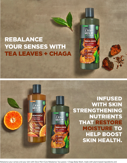 • HIGH-QUALITY INGREDIENTS: This Dove Men+Care Rebalance Body wash is made with tea leaves and chaga to rebalance your senses and for superior skin hydration