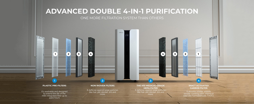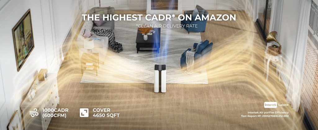 • <b>SUPERIOR PURIFICATION CAPACITY: </b>Filters up to 4650 sqft in 1 hour/ 2325 sqft in 30 minutes with a 1000 CADR for Extra large room coverage. Dual air intake and twin-turbo fans offer up to 2X4 layers of filtration through two plastic pre-filters and two multi-Integrated Filter Sets - combining non-woven fabrics filter, H13 Medical Grade HEPA filter, and activated carbon filter in one set.