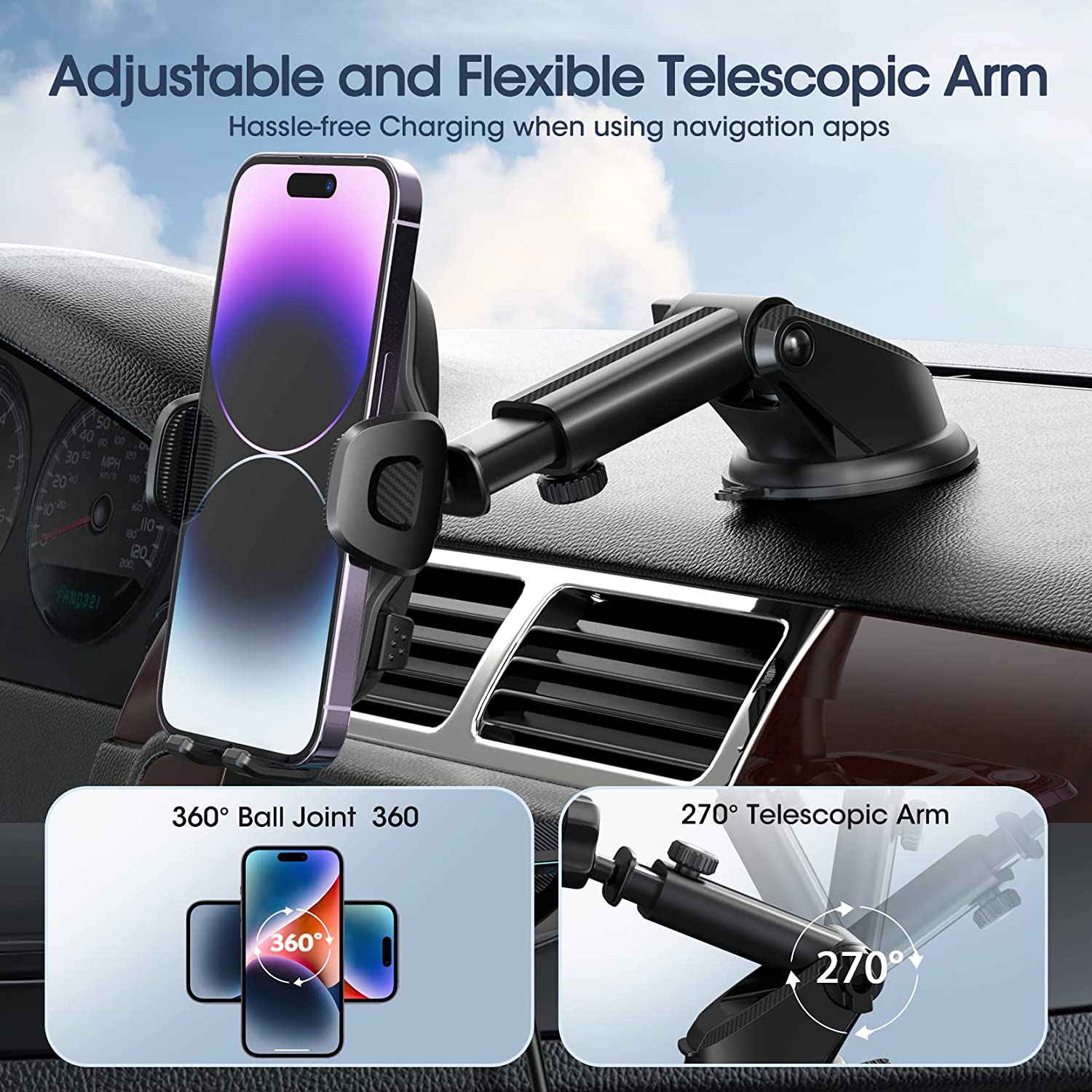 • 【3in1 Car Phone Holder】The newly upgraded car phone holder adds an accessory vent clip, which covers three installation methods. You can use it as a dashboard phone holder, a car vent phone mount, or a windshield phone holder. In addition, we added Some design elements, such as some carbon fiber textures and silver edging, make the product more fashionable. The groove on the clamp arm is our humanized design, and it is more comfortable to press the clamp arm