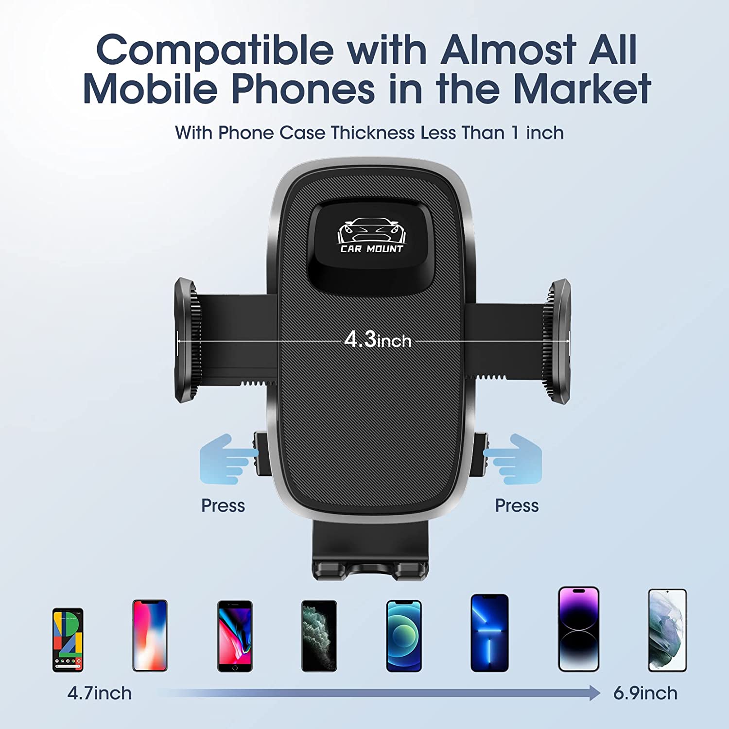 • 【Compatible with Almost All Mobile Phones】The clamp arm of this car phone mount can be extended, and the support feet can also be pulled down, so that there is more space to clamp large mobile phones. There is no problem with 4.7-6.9-inch mobile phones, which almost includes the size range of all smartphones. At the same time, compared with ordinary car cell phone holders, it can also adapt to thicker mobile phone cases, and the thickness is about 1 inch.