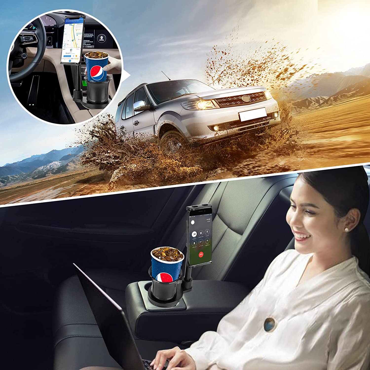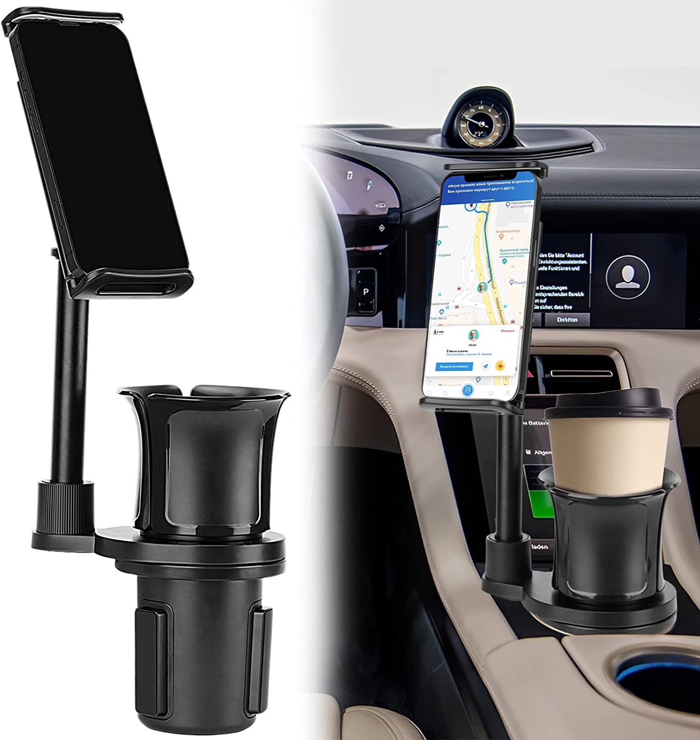 • 【2 in 1 Car Cup Phone Holder】The car cup phone holder could hold your handing cup and also hold the phone or pad. The bottom of the cup holder is designed with an adjustable tripod, which can be very stable for any prototype. Rational use of interior space, don't get caught in vents or glass to block your view, ideal for compact cars and all other cars. By placing a cup and a mobile phone at the same time, you can eat, drink, watch videos, get navigation and do anything with your free hands.