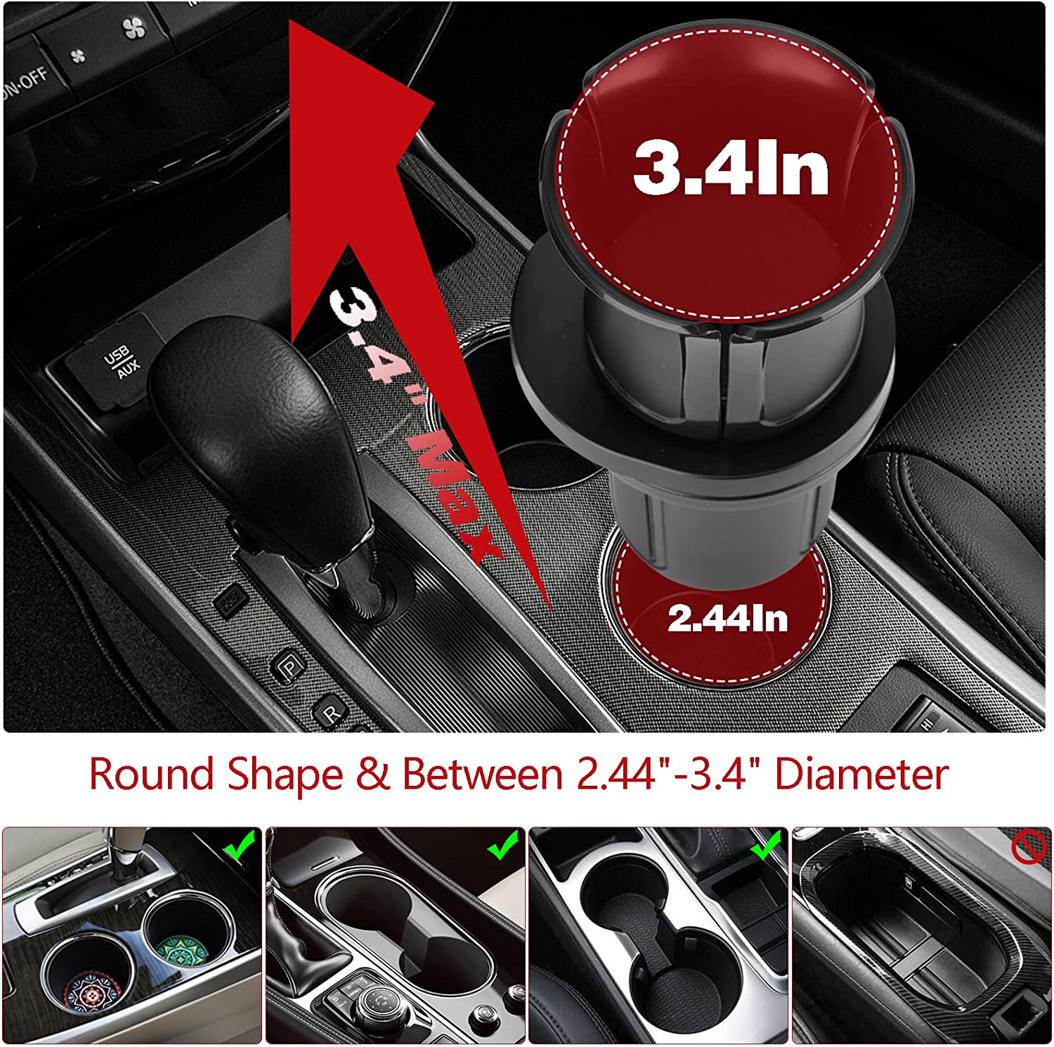 • 【Adjustable Cup Holder】The base diameter can be expanded from 2.5 inches to 4.33 inches to fill the console cup holder, which is suitable for different vehicles and compatible with SUVs, RVs, golf carts, treadmills, combined sofas, etc, and it can also be used in the back row cup holders. Super stable base with three protruding extension structures and non-slip silicone, forming a triangular locking structure without popping out. Fit varieties of shape cup holders, DON'T FIT square cup holders.