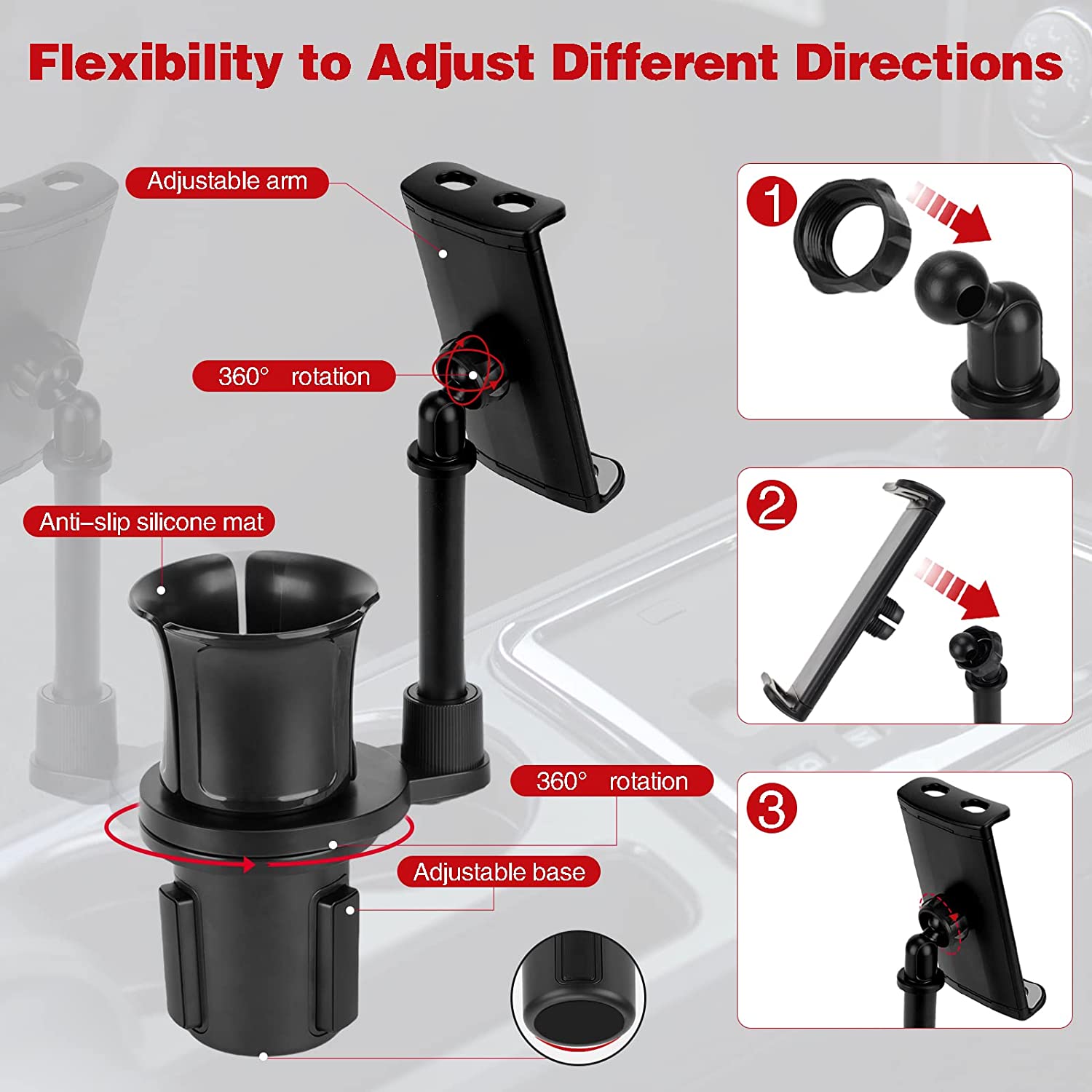 • 【360°Rotating & Adjustable】The cup holder phone holder mount uses a one-piece aluminum alloy rod that is rock solid. Compared with the gooseneck cup phone mount for cars and the crank arm cup holder car mount, the sturdy straight rod will not shake or bow on bumpy roads. The car phone mount head can be rotated at 360° and can be adjusted to suit your position. Inserting the cup holder just rotate the vane clockwise to expand the size of the bottom adapter and firmly fix the base.