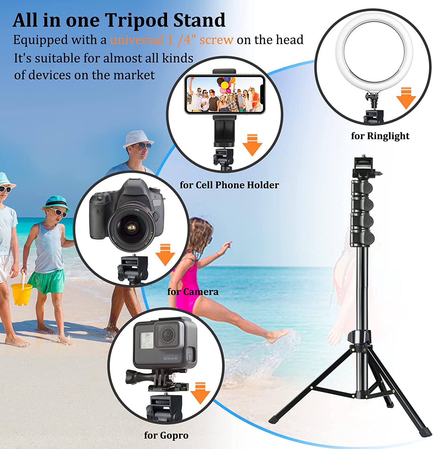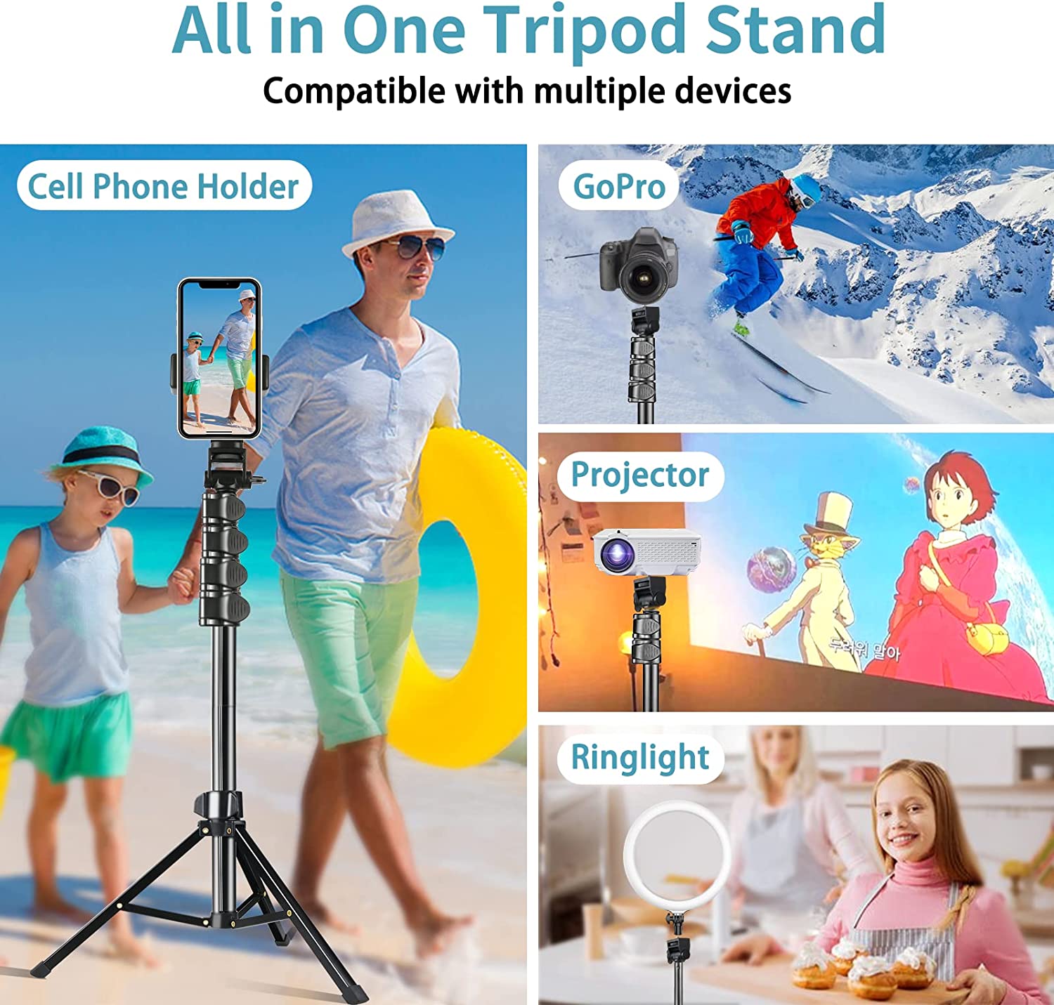 • 【WIDE COMPATIBILITY 】 Tripods for cell phones come with a universal phone holder, which can be freely adjusted from 2.4" to 3.6", suitable for phones and android. Coupled with the top of the stand, universal 1 /4" screws can be connected to most digital cameras, sports cameras, and GoPro.