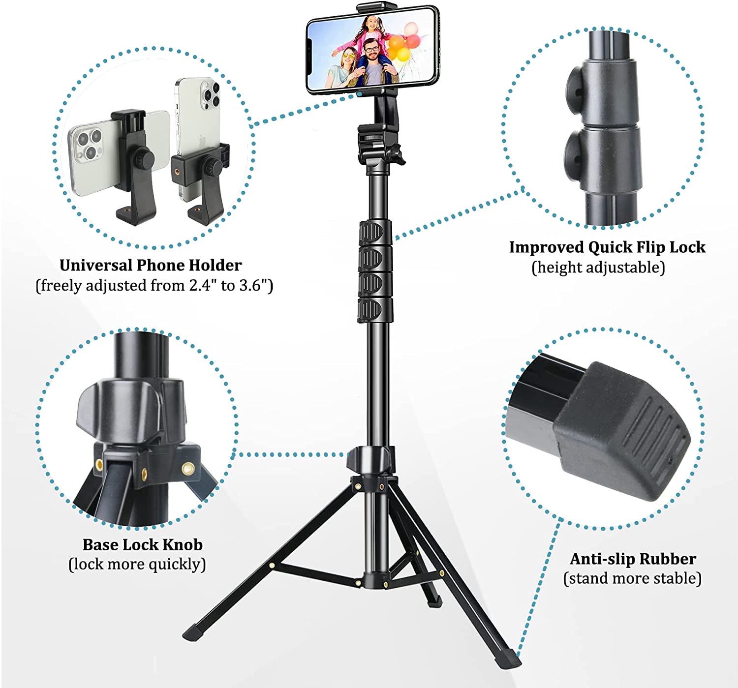 • 【REINFORCED TRIPOD BASE】The base of the newly upgraded cellphone tripod adopts a reinforced design with a silicone non-slip foot pad-the adjustable tripod is kept incredibly stable on both the floor and a desk. It's very easy to use, just press the button on the bottom to unlock the three legs of the tripod for the phone.
