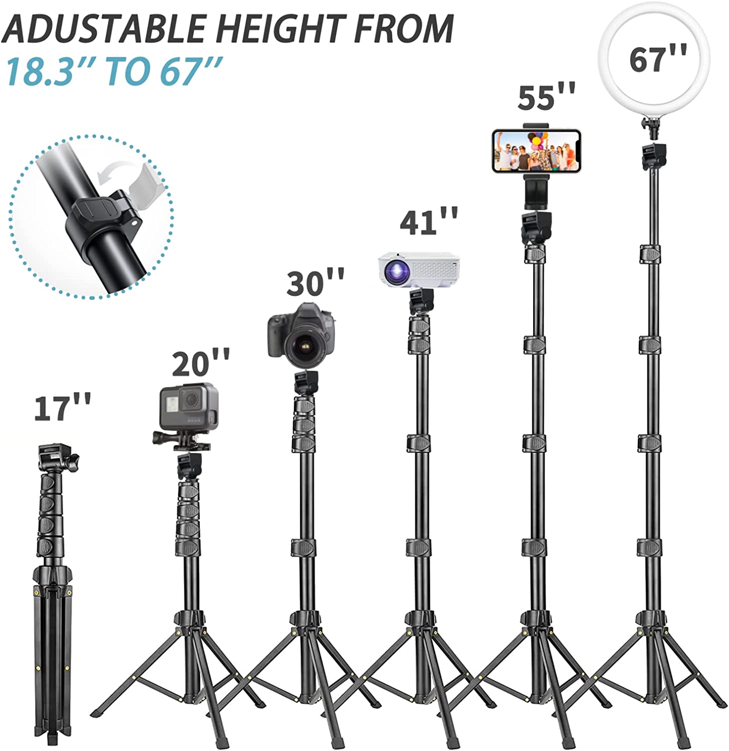 • 【67'' ADJUSTABLE HEIGHT & PERFECT ANGLE】 Twisting to lock & extendable 67-inch cell phone stands for a Phone or Camera with 4 sections of the telescopic pole that extend from 18.3 '' to 67'' - adjust the shooting angle, allowing you to shoot heights that other 60'' or 62'' cell phone tripod cannot shoot. 180° neck rotation, you are able to adjust the phone/camera holder vertically or horizontally to any angle you want, you can rotate it smoothly, and it allows the phone to take pictures in a vertical position.