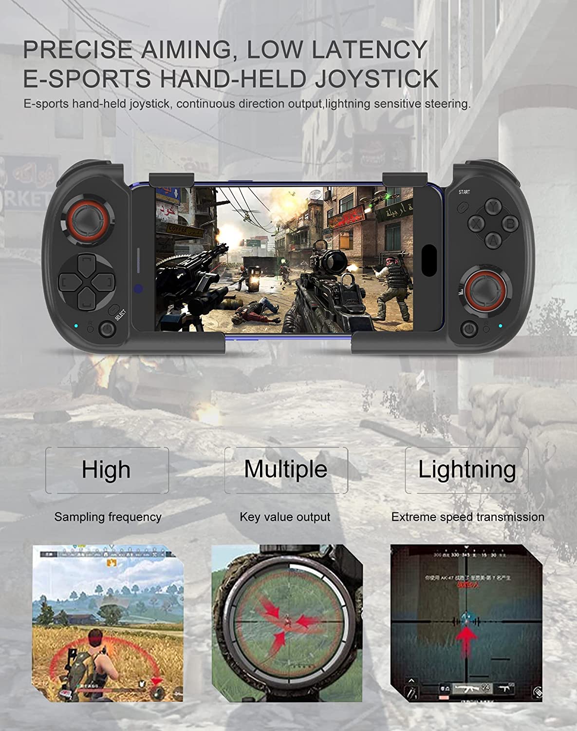 • ?【Support One-Handed Operation】The gaming controller can be split into two separate left/right controllers, ergonomically designed for easy grip and operate smartphones in One hand.