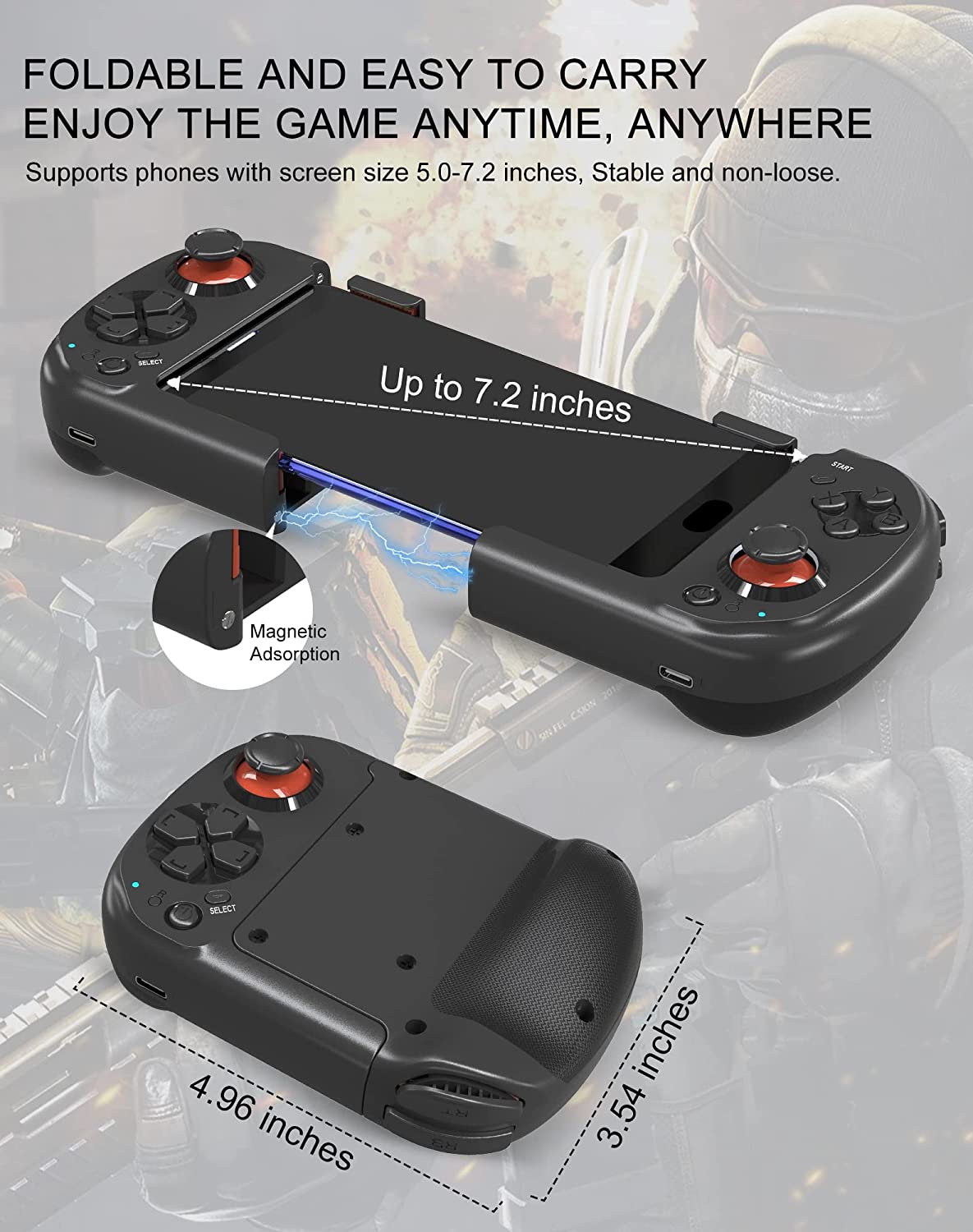 • ?【Foldable and Easy to Carry】: when you use it, it can be used as a phone stand to put your phone on the controller to play games, when not in use, the controller can be folded with magnetic adsorption, very easy to store and easy to carry. You can enjoy the game from anywhere, ideal for outdoor, travel.