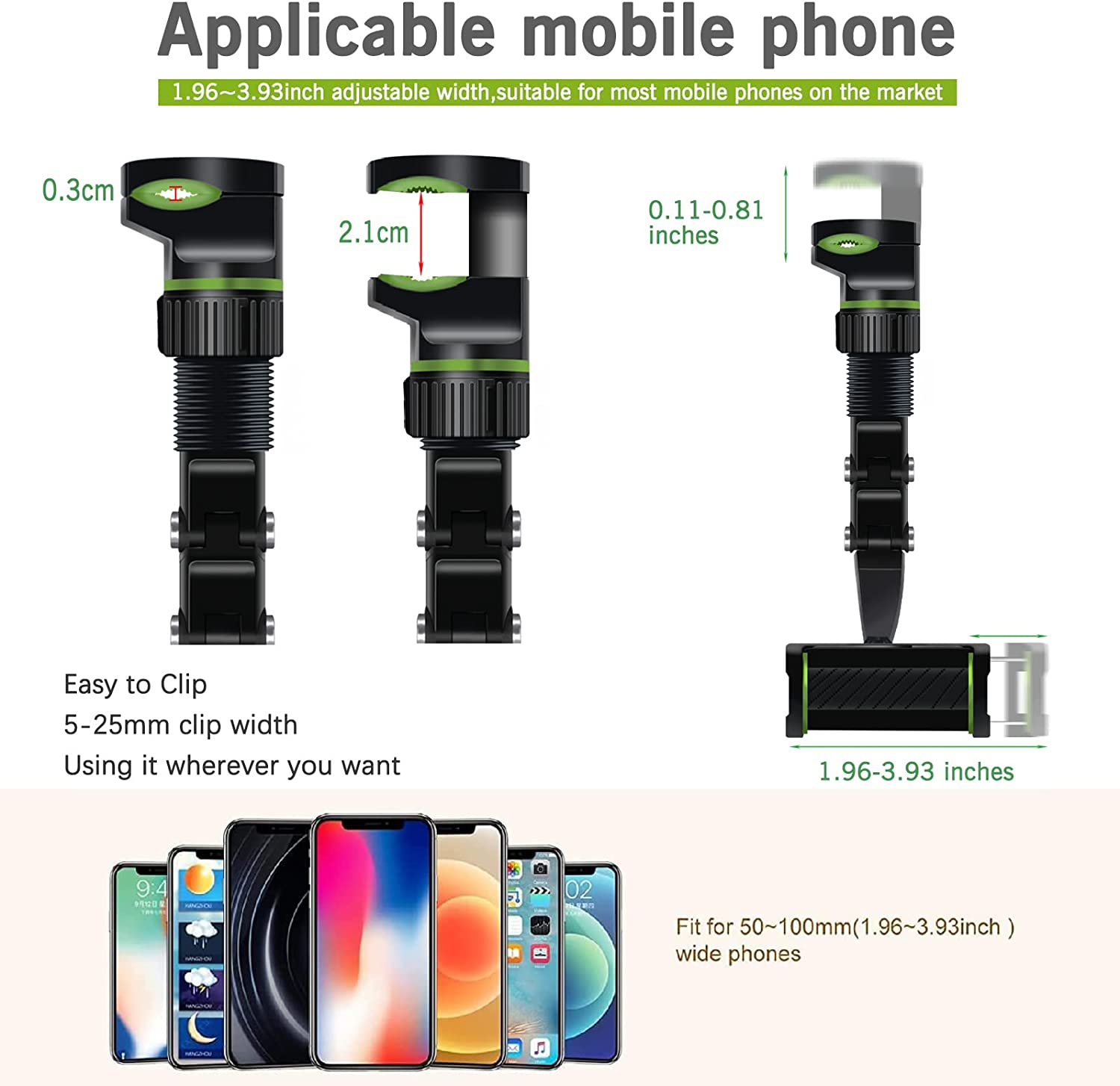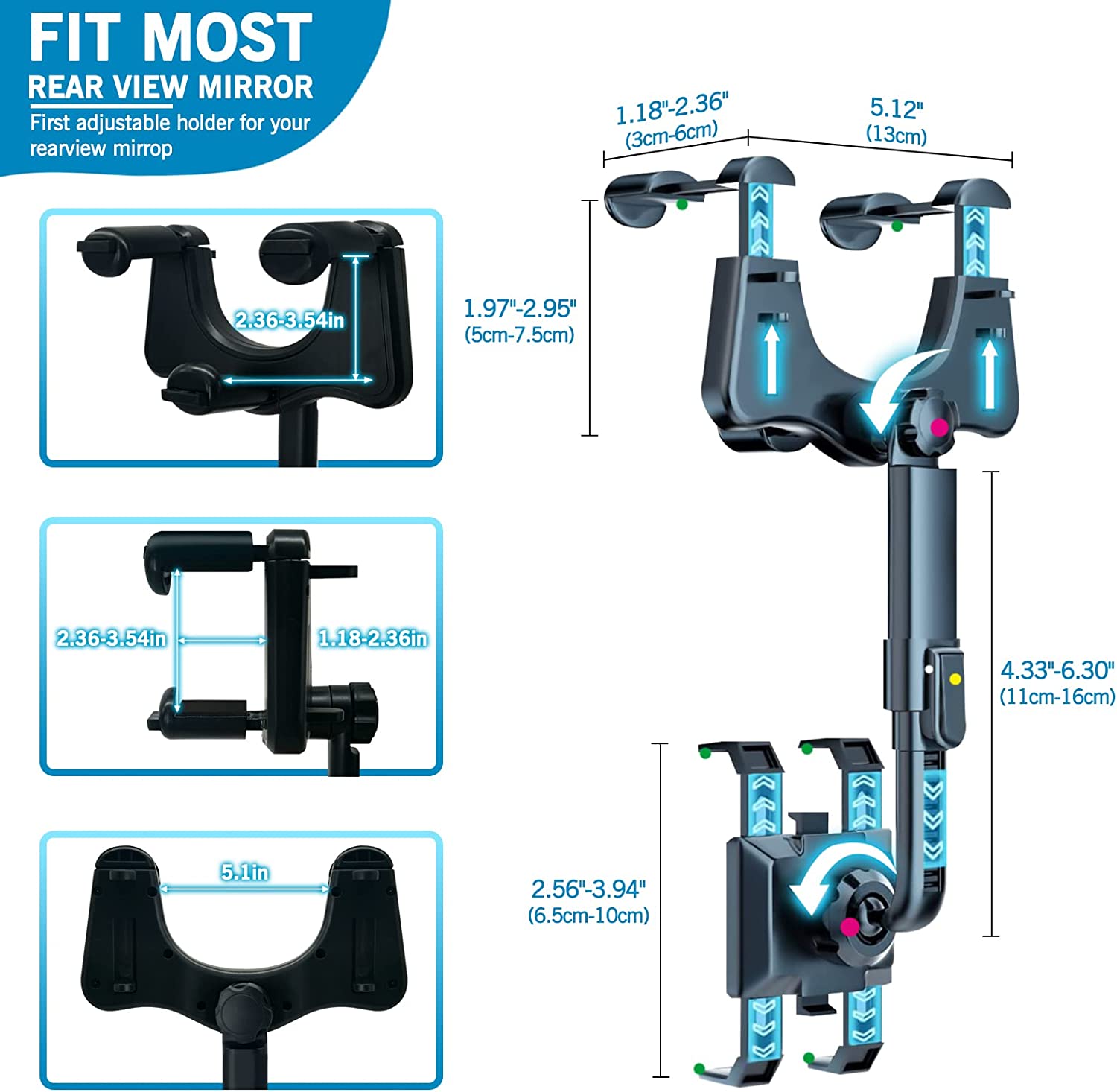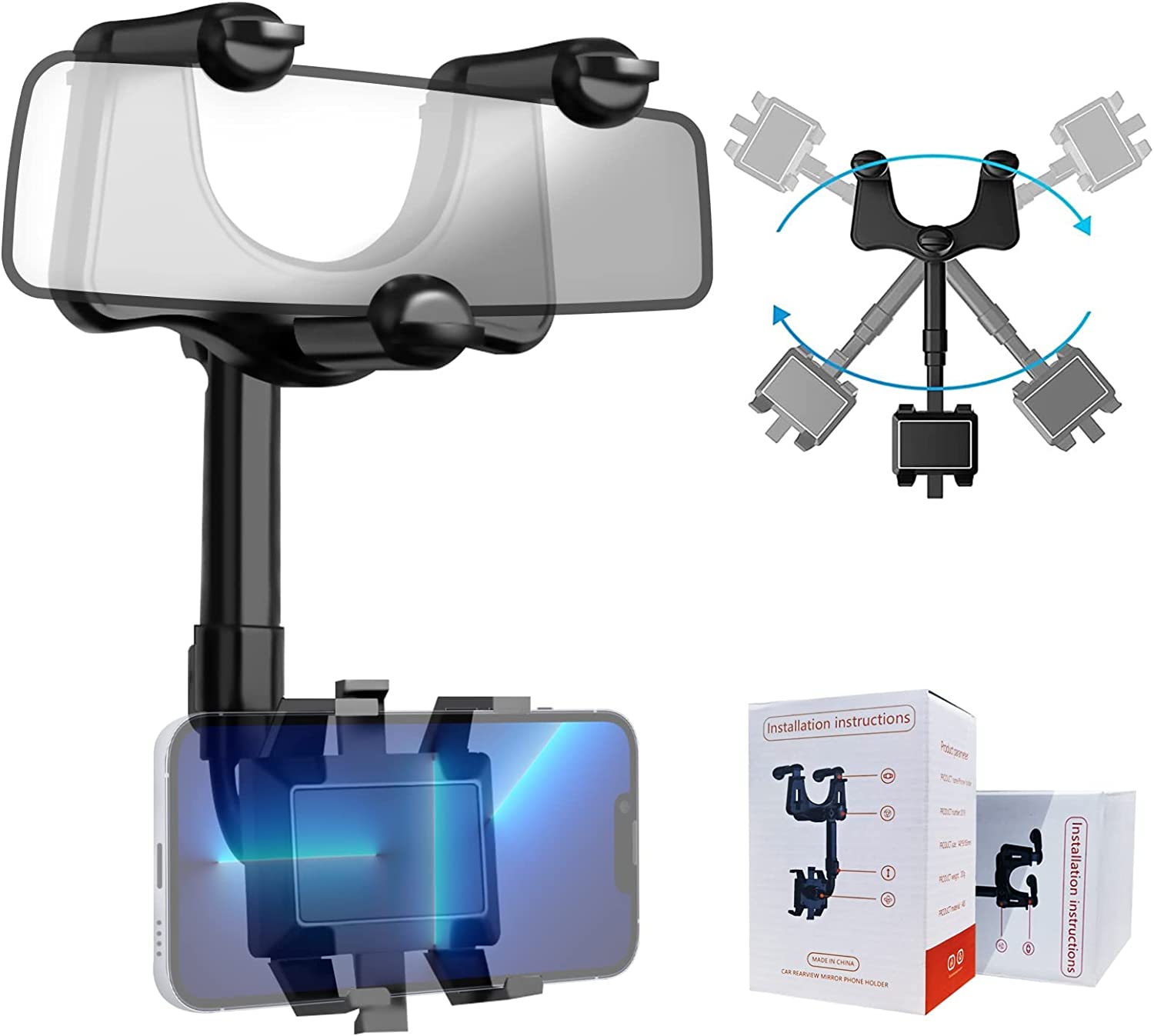 • 【360 DEGREE ROTATION ADJUSTMENT】 Multifunctional rearview mirror phone holder with 360° rotating structure, you can put your phone in any direction (horizontal, vertical and more) and just enjoy the best driving experience. At the same time the arm length can be telescoped 0-5cm, will not block your view.