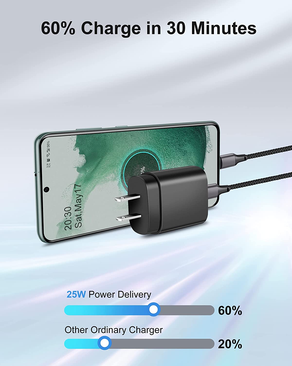 [25W Samsung Fast Charger] 25W USB C charger block with PD 3.0 fast charging USB C port provides Max 25W output power. Adaptive fast charger for Samsung Galaxy S23/S22 from 0% to 60% in 30 minutes, save you about 1 hour and helps you work efficiently.