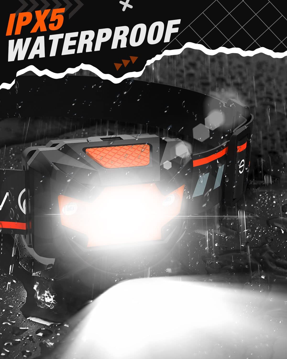 • Waterproof and 4 Modes: The headlight has IPX5 waterproof rated. The sealed shell is leak-proof, which is suitable for rain or snow, indoors or outdoors. You can switch the strong beam, weak beam, red beam, SOS red strobe.
