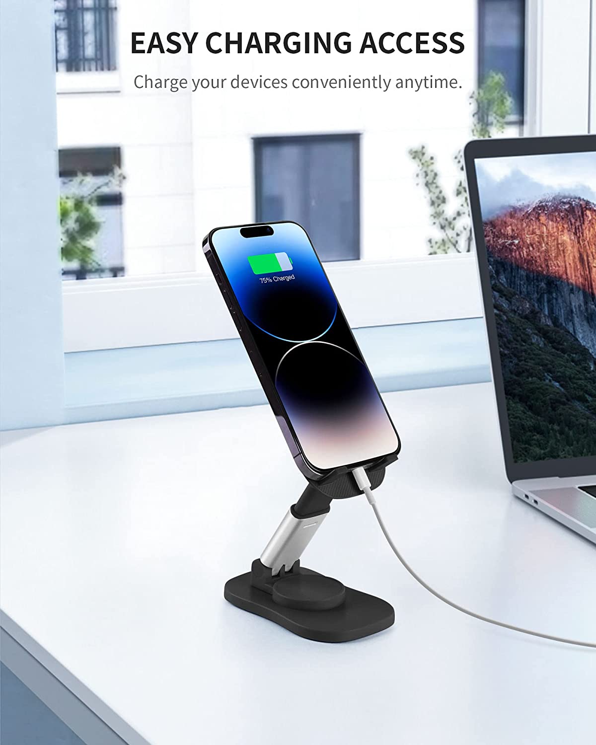 HANDS-FREE ENTERTAINMENT - Having this desktop phone holder to prop up your phone and adjust it to the ideal position, you can free your hands while watching videos, making phone calls, using Facetime, and viewing recipes. Plays a good role in your office, kitchen, nightstand, or dining table.