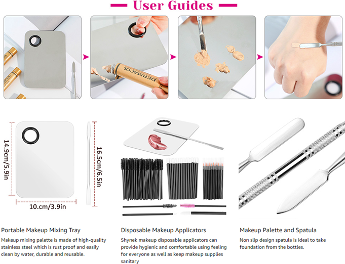 • Wide Application: The makeup tray is excellent for mixing foundation, blending lipstick, eye shadow, concealers, pigment, lash adhesive or nail polish. The disposable makeup wands applicators are good for daily makeup or for clients to try sample of lipstick or mascara in cosmetic counter