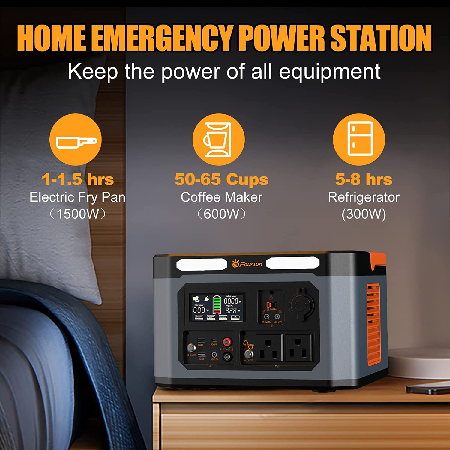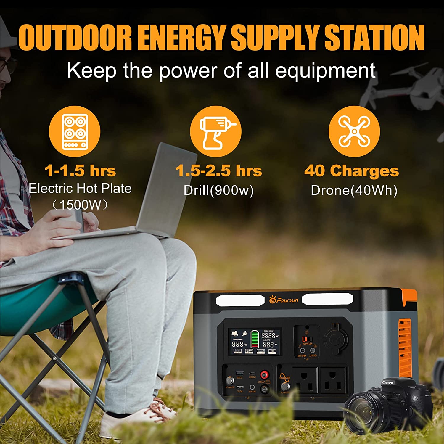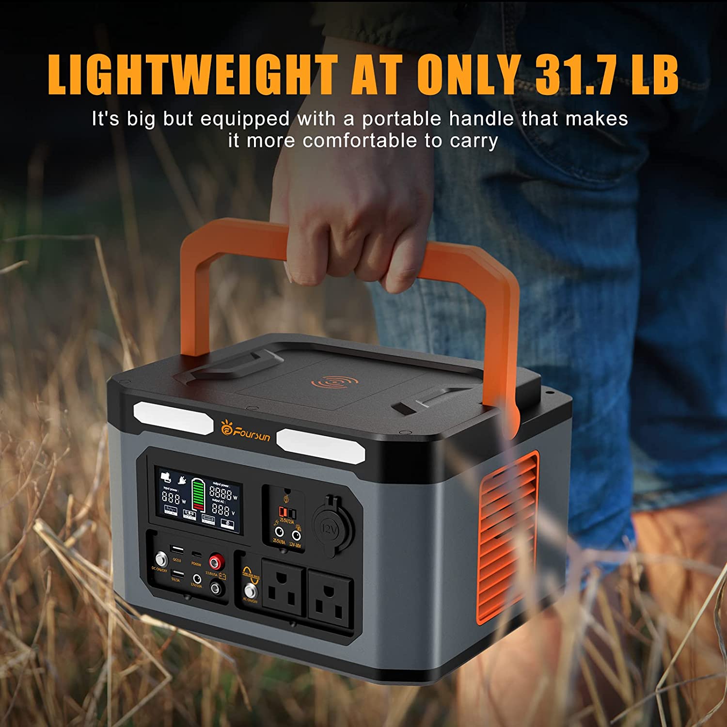 • 【Huge Capacity & Portable Power Station】Foursun 1500 is a portable power station with 1598.4Wh,the power station is rated to provide a pure sine wave 1500W load capacity(3000W Peak). which to meet different kinds of electricity demands outdoor usage for home, travel, camping, backseat on long road trips. It's big but equipped with a portable handle that makes it more comfortable to carry.