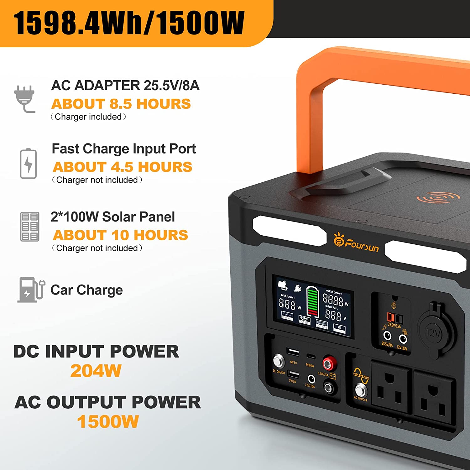 Foursun 1500W(3000W Peak) Portable Power Station,1598.4Wh with 2 x 1500W AC Outlets ,Wireless charge,PD 65W,Solar Generator (Solar Panel Not Included) for Home Backup, Emergency, Outdoor Camping