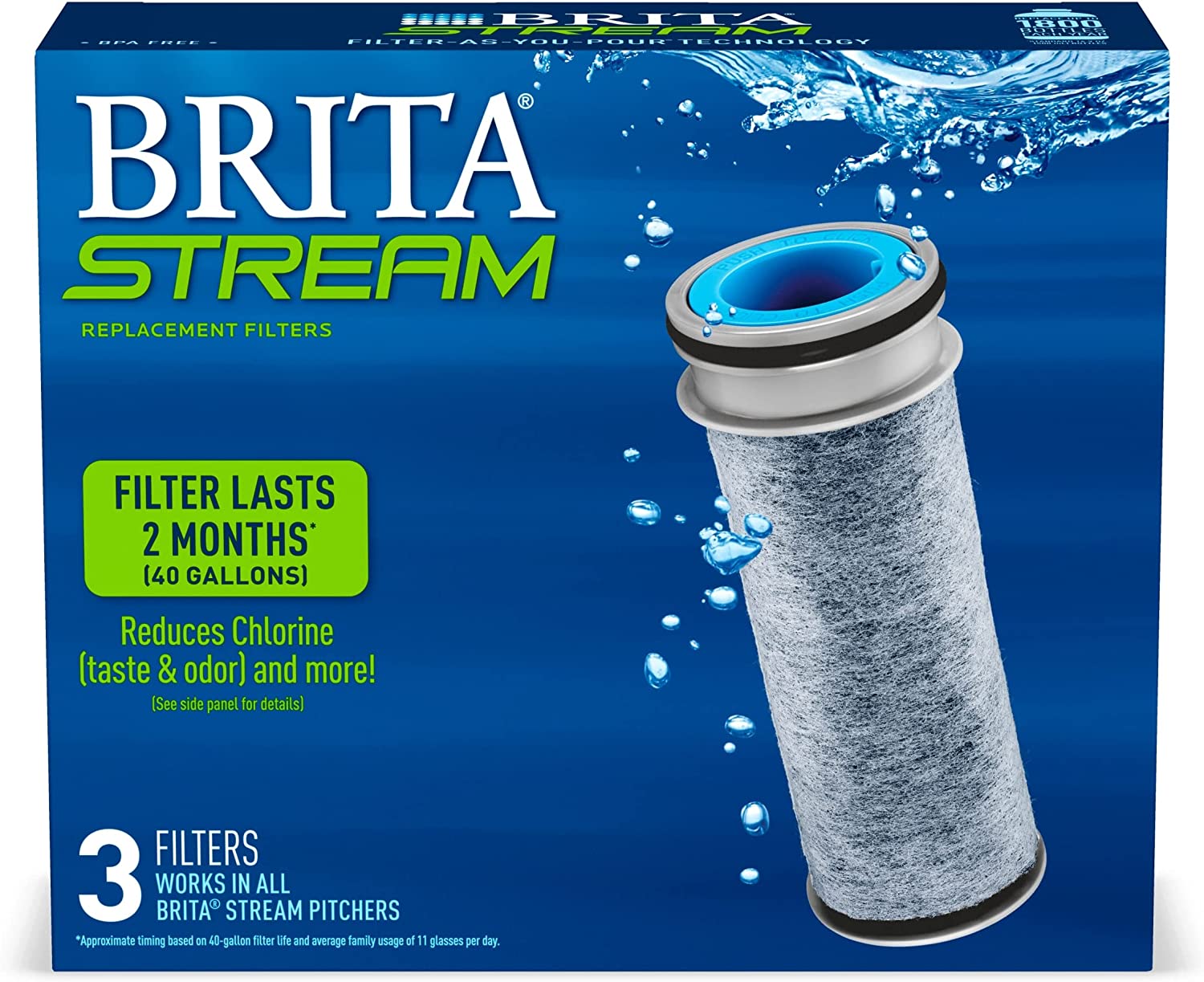 BPA-free Brita Stream Replacement Filters are made with Filter-As-You-Pour technology so you can get filtered water 10X faster compared to the market leading pitcher system. Made with proprietary dual-layer filtration technology and containing activated carbon to reduce chlorine taste and odor., These filters deliver great-tasting water and maintain a healthy level of fluoride, an additive in water that promotes strong teeth (applies to fluoridated municipal tap water). The filters have an easy-hold grip and click button for simple insertion and removal. Change these filters every 40 gallons, about 2 months for the average family, for best performance. The innovative carbon form means no black flecks. One Stream filter can replace 300 standard 16.9 ounce water bottles. Drink cleaner, great-tasting water with Brita.