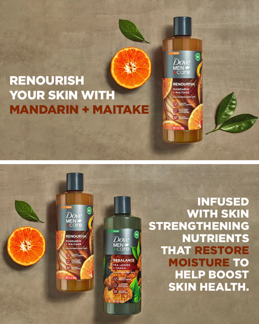 Renourish your skin with Dove Men+Care Renourish Mandarin + Maitake Body Wash, made with plant-based ingredients and nutrients for healthier, hydrated, and stronger skin.