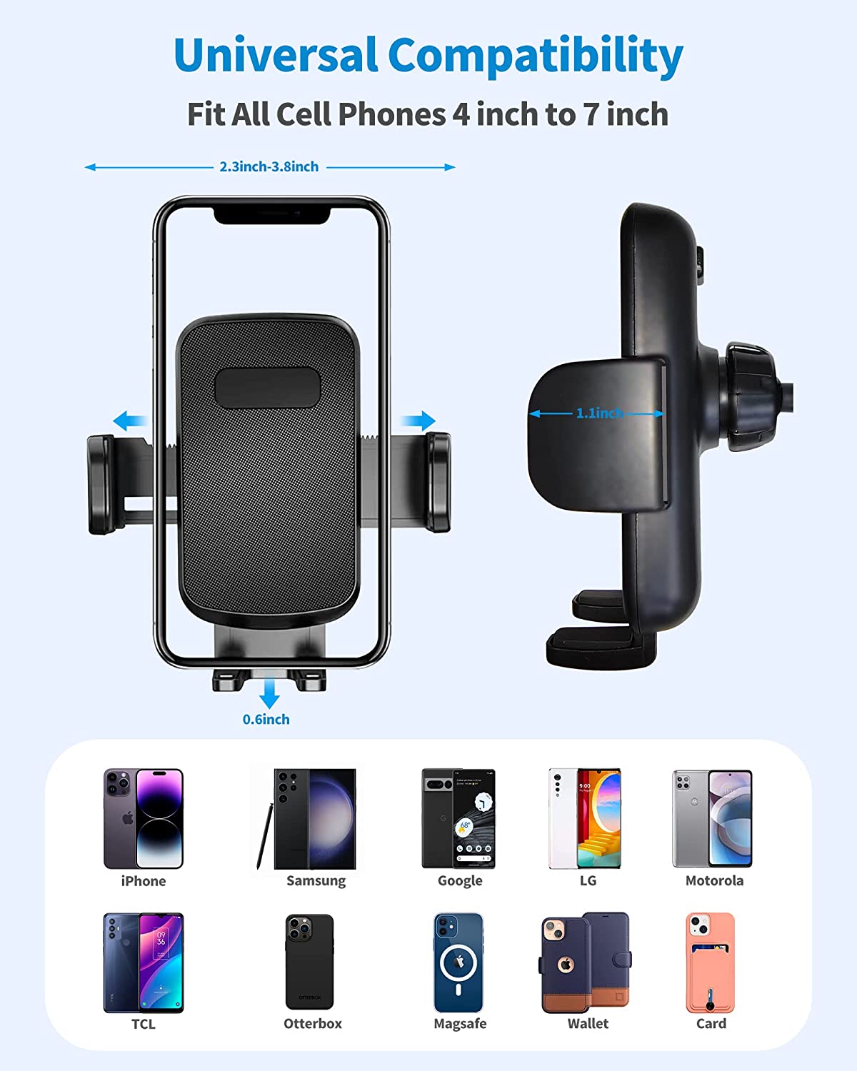 【Easy to Operate】The phone mount for car is easy to operate and can be operated by one hand. Press the button on the back of the car mount to open the clip with one click, and push the clip with one hand after placing the phone. This phone holder for car is suitable for 4-7 inch mobile phones, including all mobile phones with cases.