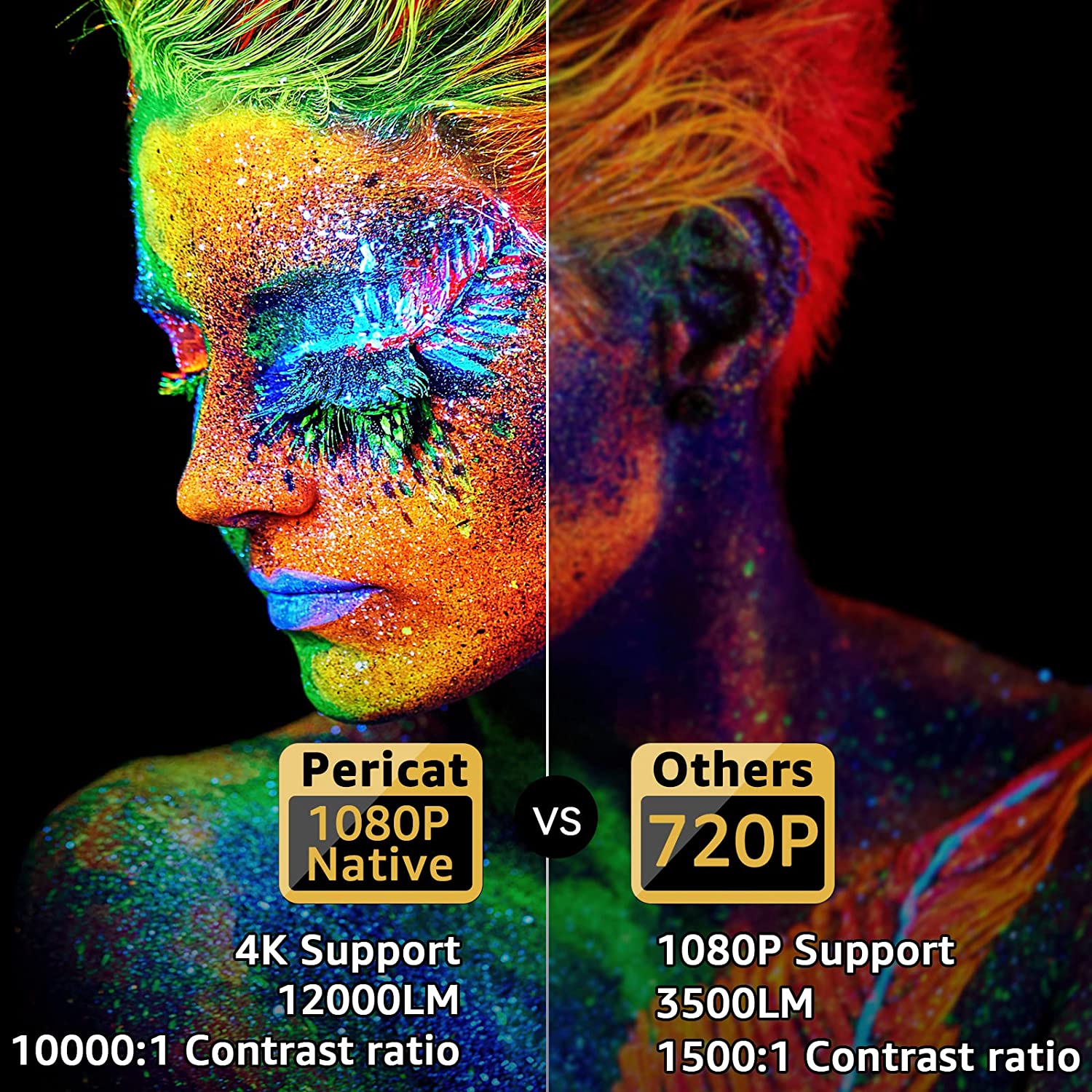 - 【Native 1080P & 4K Support 】Featured with 1920*1080 full HD resolution and 4K Support technology, Pericate Q9 video projector restores the true color of the picture without downscaling or compression, provides clear and high definition images to reduce eye irritation.