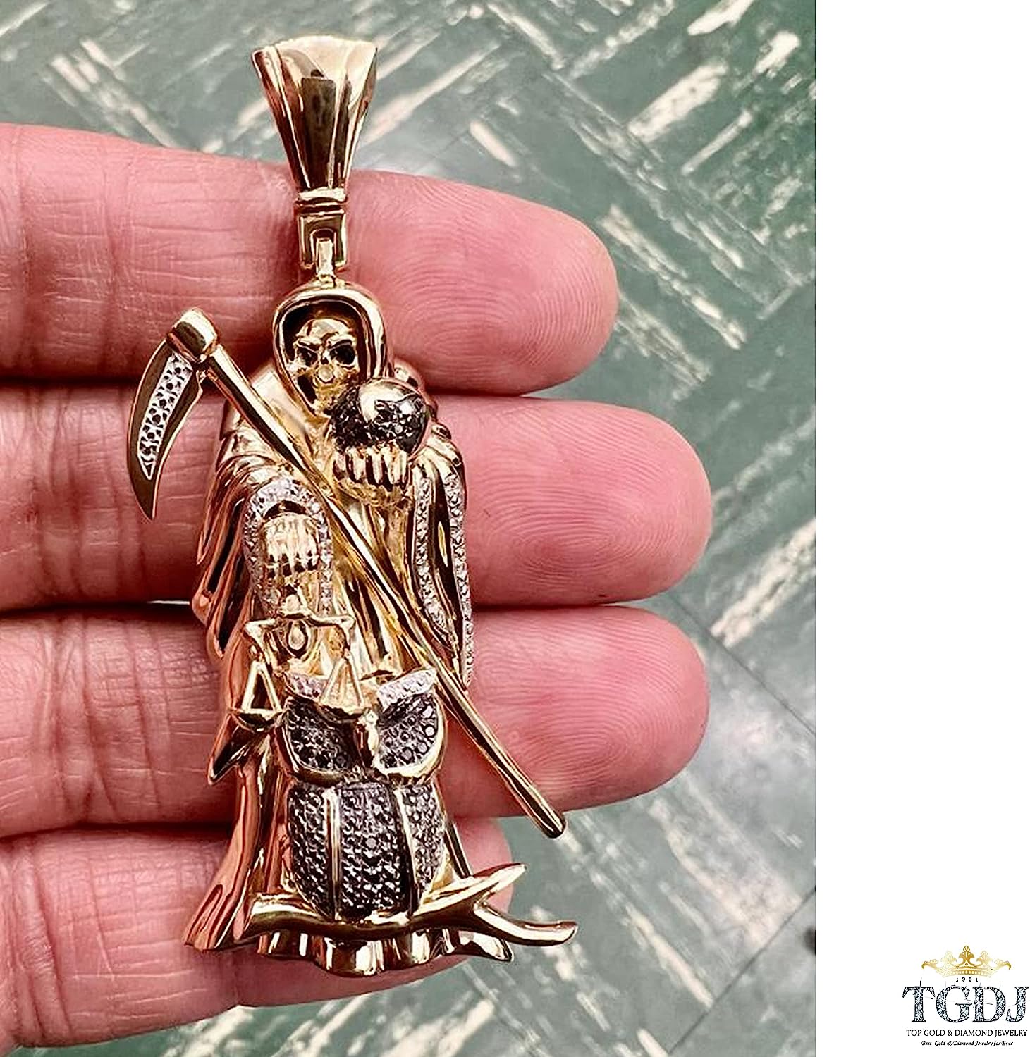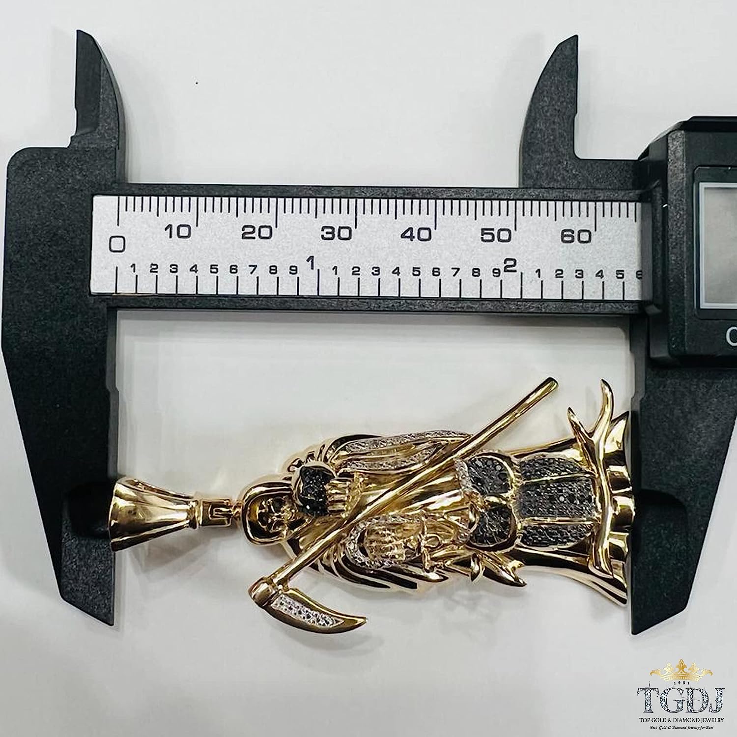 10K Yellow Gold Diamond Santa Muerte Grim Reaper Pendant For Men and Women | 2.9 x 0.9 inch Round Cut Real White Diamond Holy Death Santa Muerte Mens Pendant 0.20 CT | Unisex Custom Jewelry Gift for H