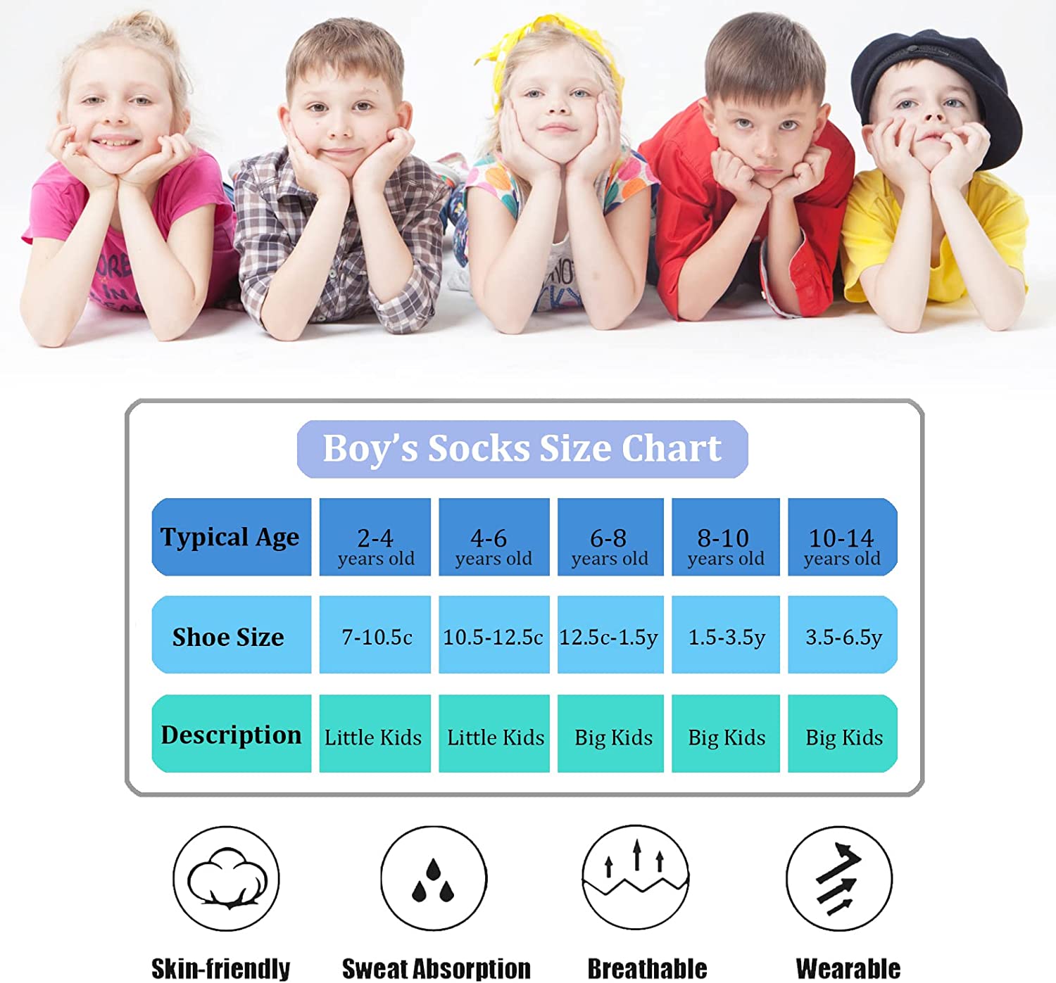 • 4 SIZE TO CHOOSE: Tsmollyu boys ankle socks have 4 sizes to choose, Small: 2-4T (Shoe size 7-10.5 Toddler); Medium:4-6 Years (Shoe size 10.5-12.5 Little Kid); Large: 6-8 Years (Shoe size 12.5-1.5 Big Kid); X-Large: 8-10 Years (Shoe size 1.5-3.5 Big Kid); Please choose according to your boys shoe size,Kids of these ages can enjoy this funny ankle socks in all seasons