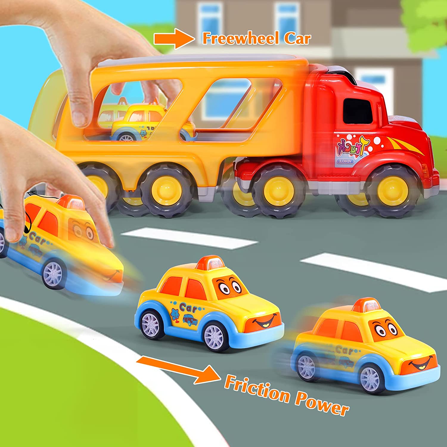Bennol Carrier Toddler Trucks Vehicles Toys - 5 in 1 Car Toys for 1 2 3 4 5 Year Old Boys Toddlers, Cute Cartoon Kids Toy Cars Friction Power Set, Push and Go Play Cars and Trucks (RED)