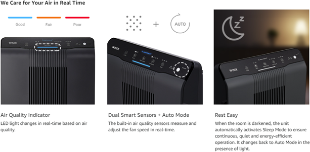 Winix 5500-2 Air Cleaner with PlasmaWave Technology. The Winix 5500-2 Air Cleaner replaces the wildly popular 5500 model. It is designed for any home environment and ready to capture dust, pollen, pet dander, smoke, mold spores, volatile organic compounds, and household odors. This unit is best used for medium to large living spaces, kitchens, or bedrooms. The WINIX 5500-2 uses a 3-Stage Air Cleaning System, featuring a Washable AOCTM Carbon Filter, 99. 97% True HEPA Filter, and Winix PlasmaWave Technology. True HEPA filter captures of airborne pollutants and allergens, while carbon filter traps offensive smoke, cooking and all other household odors. PlasmaWave Technology attacks pollutants at a molecular level to neutralize viruses, bacteria, chemical vapors, odors, and gases in the air. Air Quality Sensor offers Set-and-forget convenience by automatically adjusting your air cleaner settings to meet the needs of your environment. CADR Room Size Rating: 360 square feet - Suitable for bedrooms and living rooms Materials: Abs Dimensions: 14. 9"L x 7. 8"W x 23. 6"H Weight: 17. 5 lbs