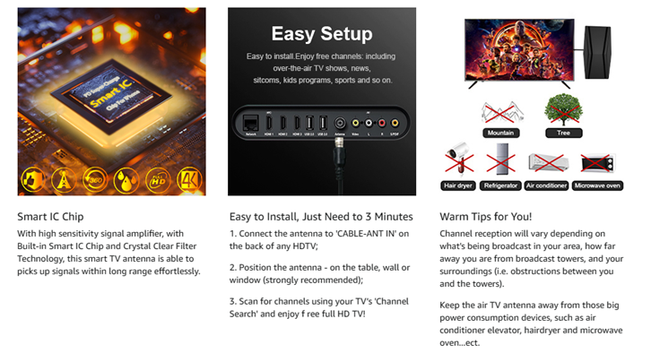 • ?FULL HD CRYSTAL-CLEAR TV & HD SOUND QUALITY: Our smart tv antenna adopts upgraded new type Smart Switch control Powerful 2023 Amplifier Signal Booster with built-in Next generation Smart IC Chip & Crystal Clear Filter Technology to picks up ALL signals within 520 miles range. New technology filters out cellular and FM signals resulting in clearer picture, lower noise and access more free broadcast TV signals with enhanced high gain, range and frequency performance.