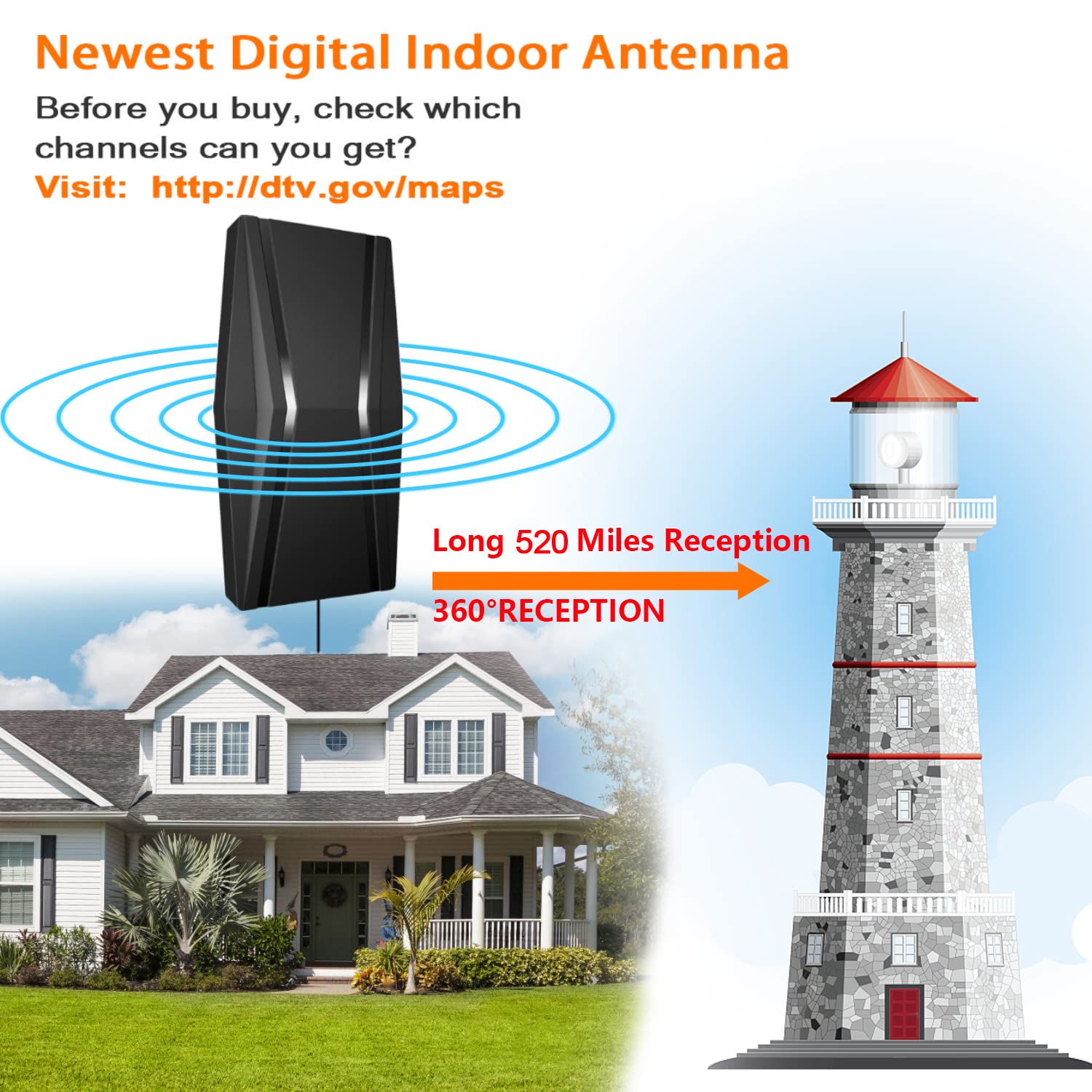 • ?UP TO 520 MILES RANGE: Comes with the newest type switch control amplifier booster and most powerful smart IC chip, reception of this indoor tv antenna can reach up to 520 miles and can be placed almost everywhere in your home. Digital antenna scans new channels constantly as they're available for broadcast. WARM TIPS: Hang the indoor antenna on a window, wall or better position where owns better reception.
