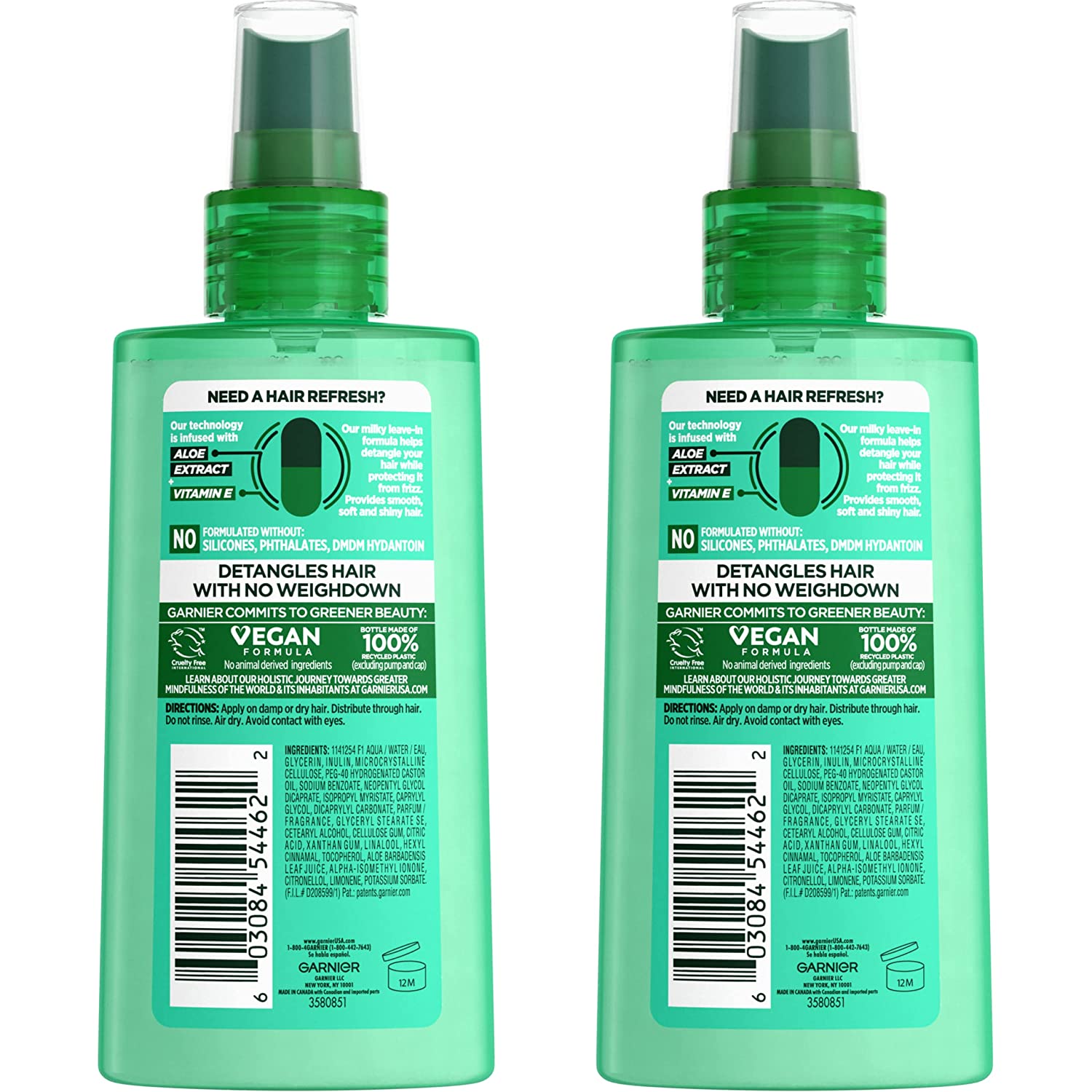 Garnier Fructis Style Pure Clean Detangler + Air Dry is a paraben-free & silicone-free hair detangler that allows you to air dry while it controls frizz & gently unties knots. Vegan formula, with no animal derived ingredients or by-products, contains Aloe extract and Vitamin E. This detangling spray helps restore your hair's smoothness, softness, & shine. Use with Pure Clean Shampoo & Conditioner for beautiful, healthy hair with every wash. FRUCTIS CARES: -Paraben-free, gentle for everyday use. -Vegan formula: no animal derived ingredients or by-products. -Bottle made of recyclable PET plastic with 50% Post-Consumer Recycled waste. -Produced in a facility committed to sustainability. Our zero-landfill site recovered 95% of its waste in 2015. -Partnered with Terracycle to keep beauty products out of landfills. Vegan formula: no animal derived ingredients or by-products