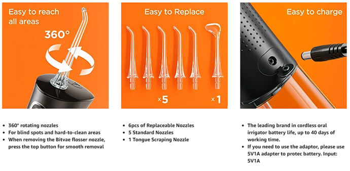 • Key Features - 3 pressure settings provide a wider range of intensity options (30-100 PSI), 6 replaceable nozzles (including a tongue scraper nozzle), 360° rotating nozzles, 60-second flossing time, IPX7 waterproof for use in the shower, universal USB cable, silent design.