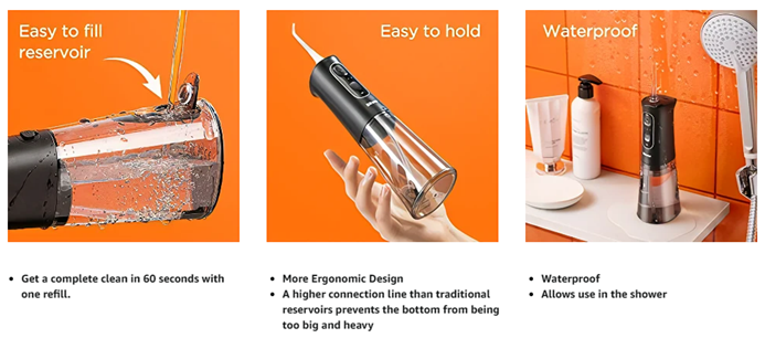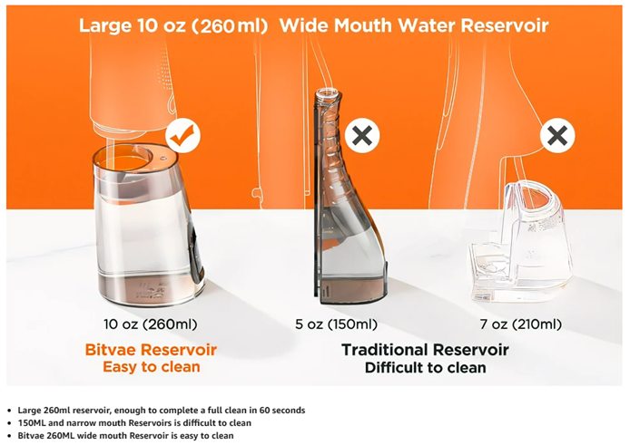 • Wide Mouth Reservoir Easy to Clean - Keeping your water flosser clean is just as important as keeping your mouth clean. With the upgraded detachable wide mouth water tank, users can completely clean the water fouling in the tank, which is impossible for the traditional water flosser picks with a small mouth water tank.