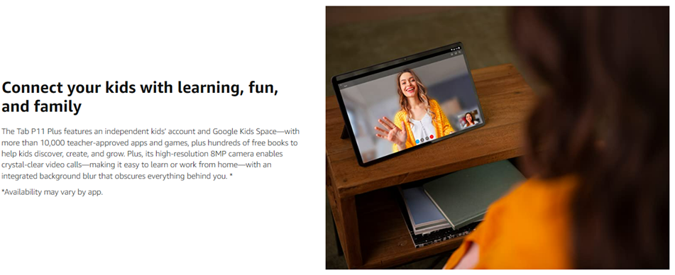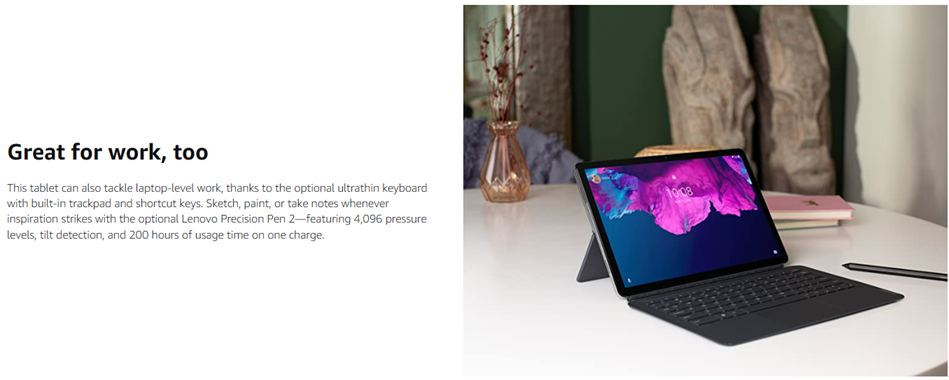Experience first-class multimedia and fun with the Lenovo Tab P11 Plus. This Android tablet features a large, 11-inch screen with 2K resolution. You'll enjoy beautiful video in the IPS LCD touch display and great audio through quad speakers with user-facing stereo tuned by Dolby Atmos®. Inside, you'll find a powerful octa-core chip, 4GB + 128GB memory. Plus, this slim and lightweight tablet delivers epic battery life in an aluminum-alloy design with a dual-tone finish available in an elegant slate grey color.Running the Android™ 11 operating system, the Tab P11 Plus tablet offers Bluetooth® and Wi-Fi wireless connectivity and a USB Type-C™ 2.0 port for data transfer and charging. You can also use the USB-C port to attach a compatible headset. Use the front or rear camera to take photos or enjoy a family video chat – this Android tablet comes with a dual microphone array and quad speakers so you'll experience crisp, clear video and sound. You can even log in quickly and easily with Face Unlock.