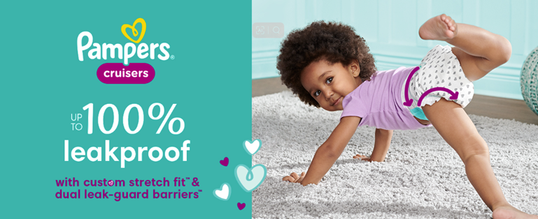 Say helloSay hello to Custom Fit and reliable protection for the most active babies! Pampers Cruisers adjust to your baby’s unique shape and size with our Custom Stretch Fit System, featuring 2x stretchier* sides for a comfy, long-lasting fit perfect for babies on-the-go. Plus, our easy-to-use fit guide on the front of the diaper helps you get the perfect customized fit. So, no matter how much your baby moves, their diaper will stay put. Pampers Cruisers are also specially designed to deliver up to 100% leakproof protection thanks to our Dual Leak- Guard Barriers that gently seal around your little one’s legs and bottom to stop leaks where they happen most. Plus, Cruisers feature our LockAway Channels that absorb wetness and lock it away from skin. And forget about wondering when your baby needs a change. The Pampers Wetness Indicator lets you know, eliminating messy guesswork. Pampers Cruisers come in a variety of prints to protect your baby in style. Plus, Pampers Cruisers are hypoallergenic and free of parabens and latex,** so, they’re gentle on your baby’s skin. Pampers Cruisers diapers are available in sizes 3, 4, 5, 6, and 7. *Vs. the leading moving baby sub-brand **Natural rubber