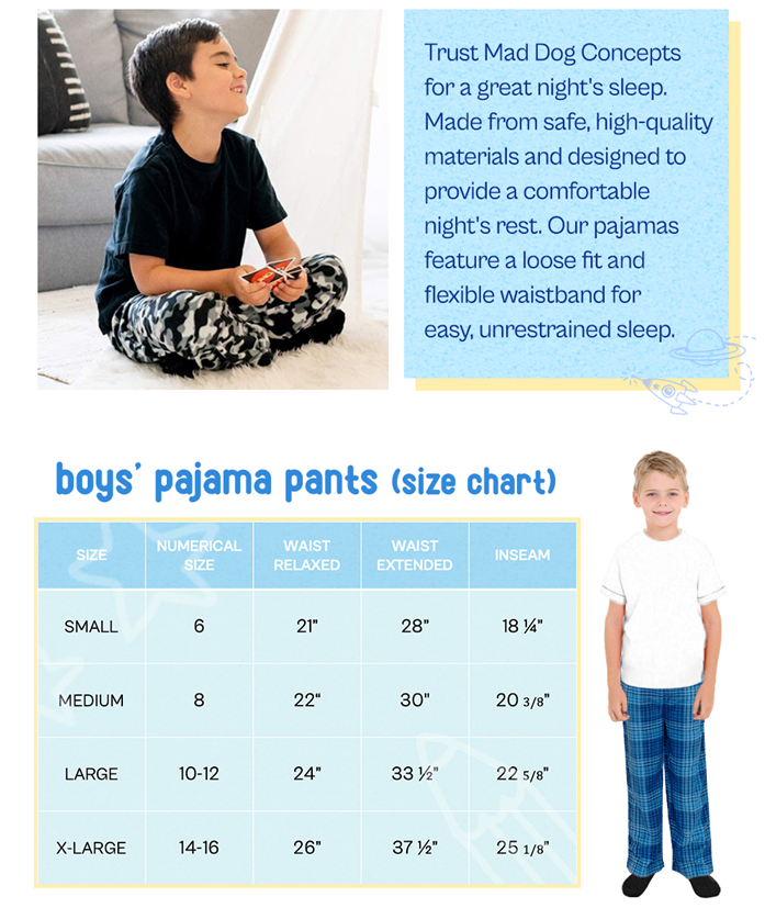 • Excellent for Playtime and Bedtime: Our boys' pajamas, which come in sizes 8, 10-12 and 14-16, have elastic waistbands and are loose-fitting to ensure that your child will sleep and play freely inside the house. Choose from a variety of styles to find your son's ideal boys pajamas size.