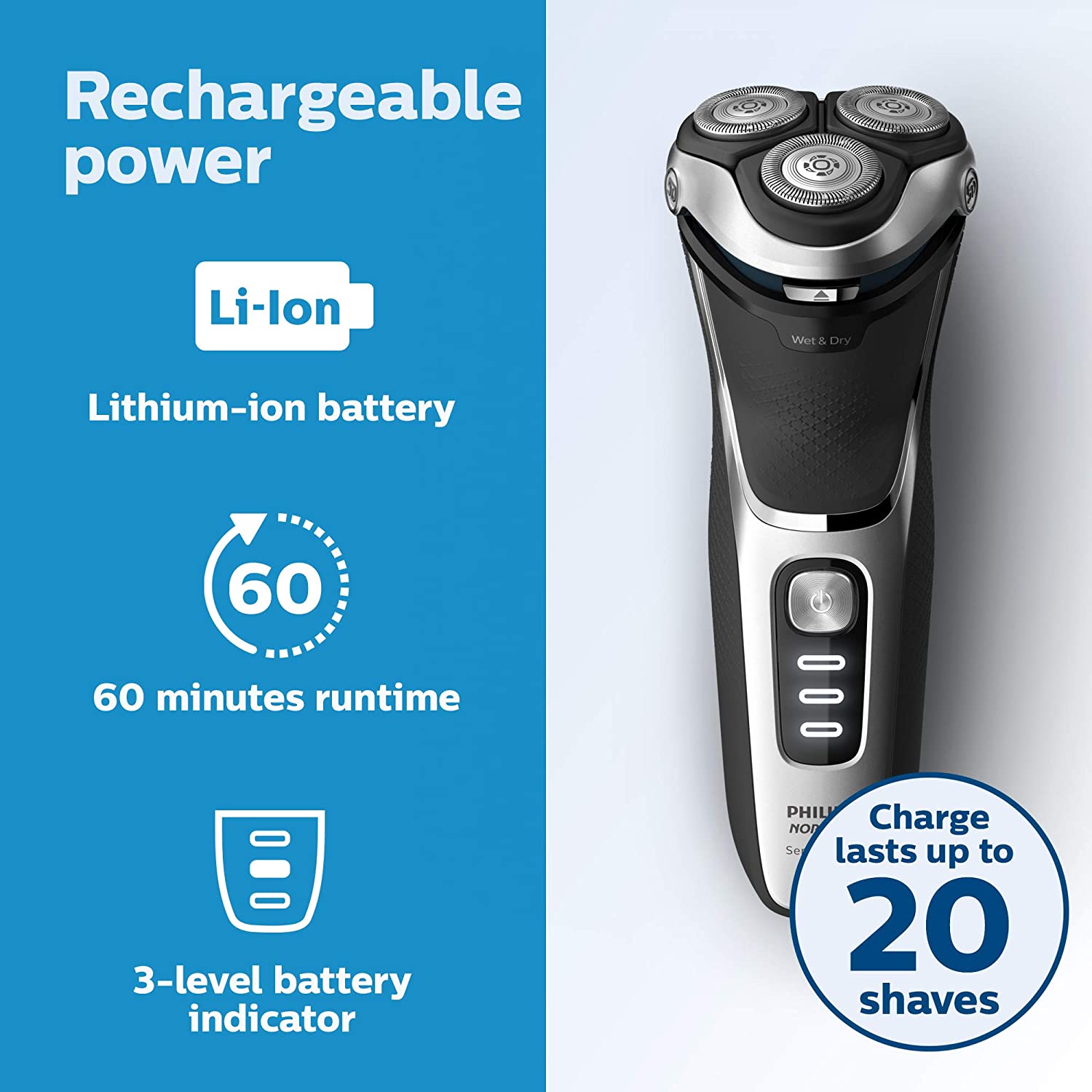 • 60 minutes of cordless shaving from a 1-hour charge Shave for up to 60 minutes on a 1-hour charge - that's about 20 shaves - with the powerful Li-ion battery. A 5-minute quick charge gives enough power for one shave. Operates in cordless mode only.
