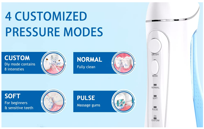 • 4 FLOSSING MODES POWER DENTAL FLOSSERS: Oralfree launch the newest portable water dental pick teeth cleaner items that was upgrade to 4 modes with Low-noise Design setting of water pressure to fulfilled your daily life use.Each mode provides you variety of using choice from standard mode, Please choose soft mode when you use dental flosser at the first time. Also helpful for bad breath, benefitful for bridge care