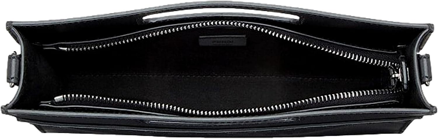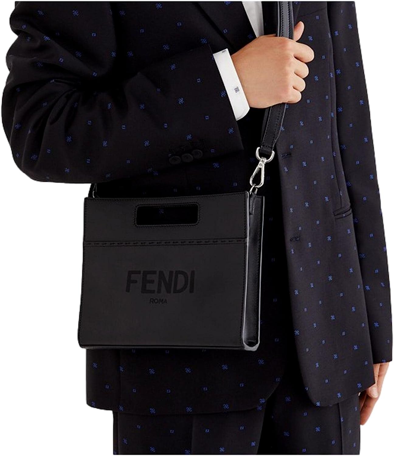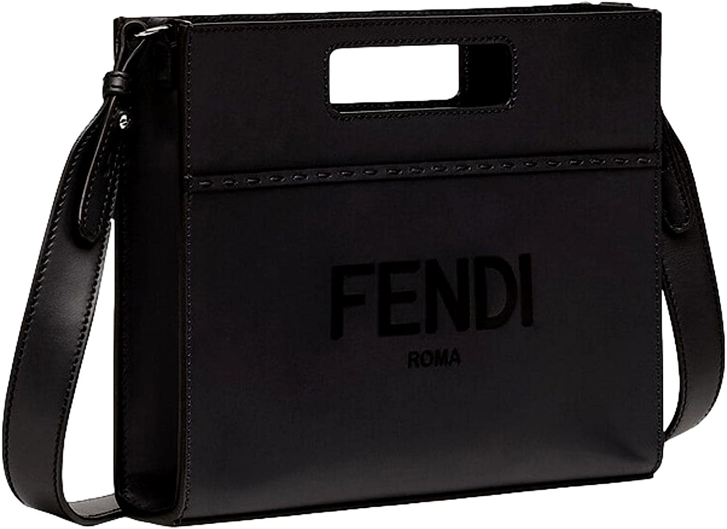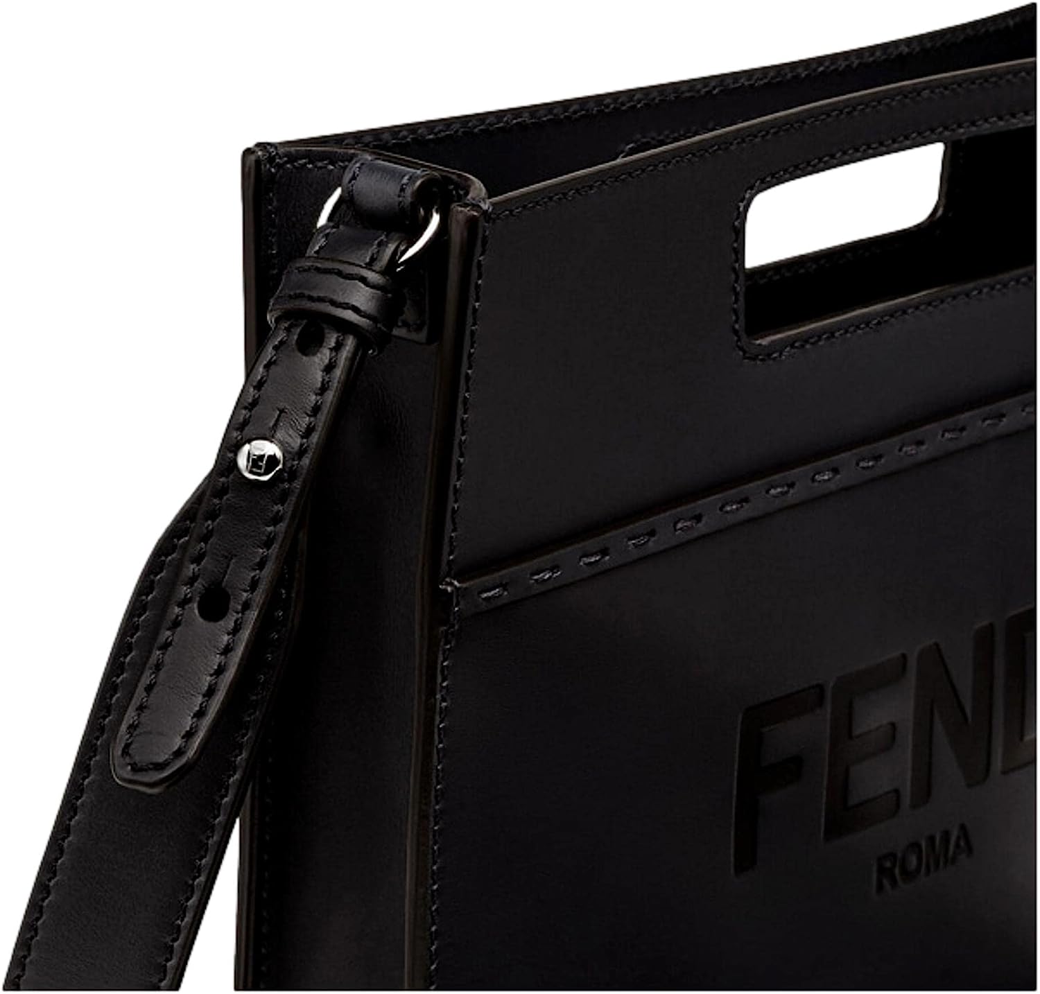 • This stylish shoulder bag is crafted of smooth calfskin leather in black. The crossbody features top handles, an optional shoulder strap so it can be carried two ways. The final detail is a bold embossed Fendi logo on the front. The top zipper opens to a compact black microfiber interior.