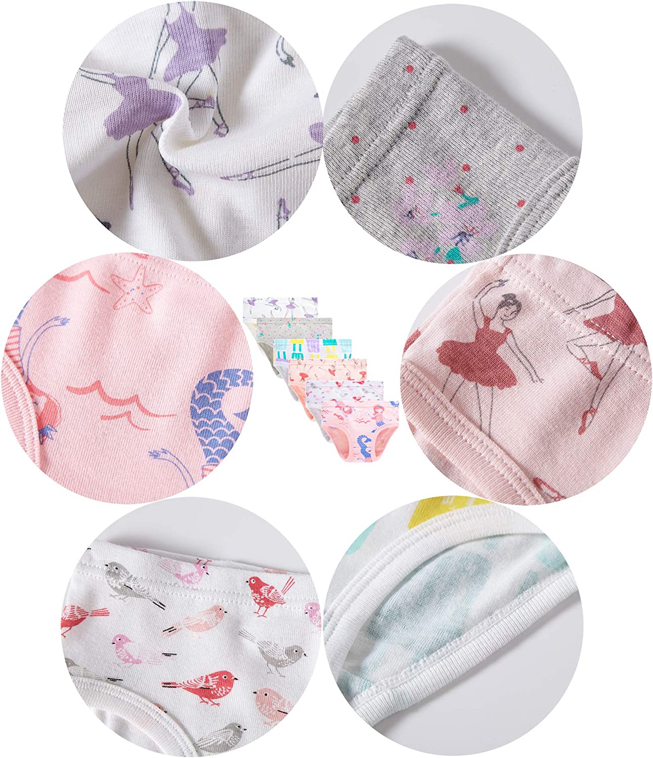 Material:100% cotton, keep her cool and comfy all day, they are ideal for everyday wearComfortable double-layer covered waistbandThe elastic leg openings make them easy to wearYour little one will adore the colorful graphics and everyday comfort of this 6-pack of girls' underwearUnderwear is designed for the safety and health for kids,we are attention to the detail ,simple but comfortable,ensure your children move freelyPackage included: pack of 6 pieces of Girls Panties
