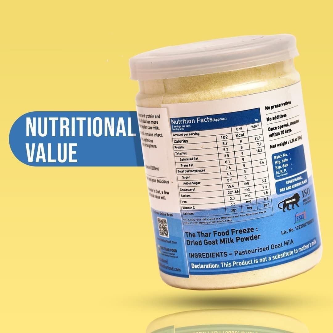• Pure & Natural: Thar Food Goat Milk Powder is 100% pure & natural with zero additives and preservatives. It is lab tested and manufactured in ISO certified plants.